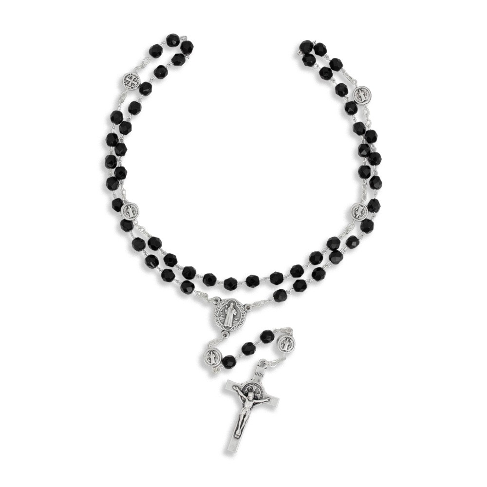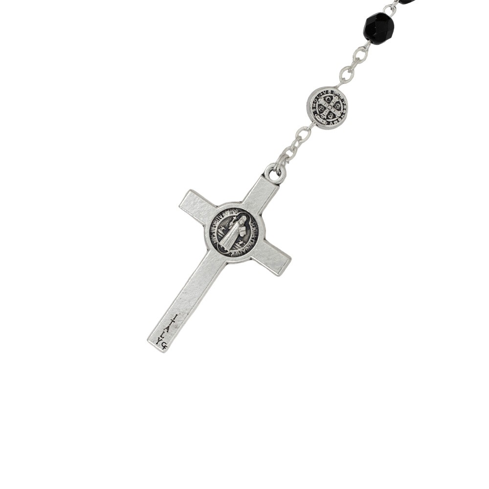 Saint Benedict rosary chaplet with small black grains, medals and crucifix in silver metal.