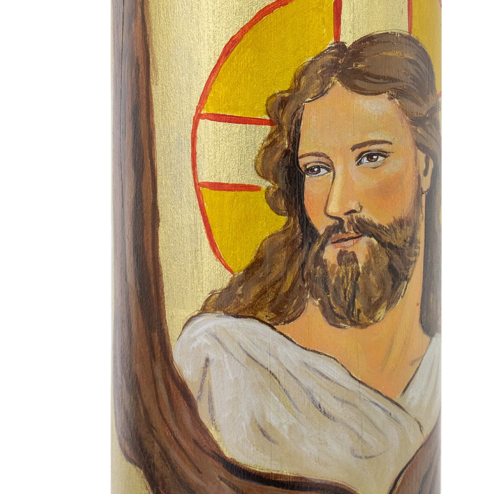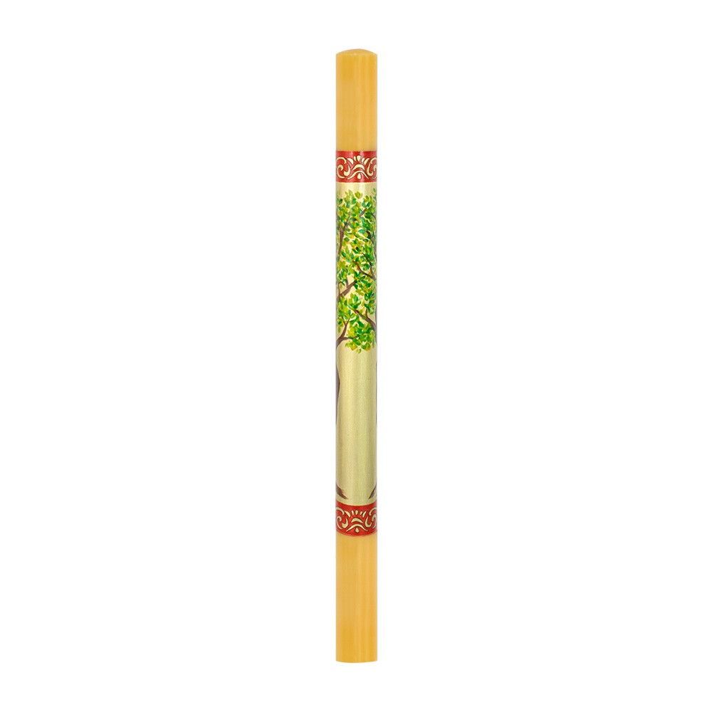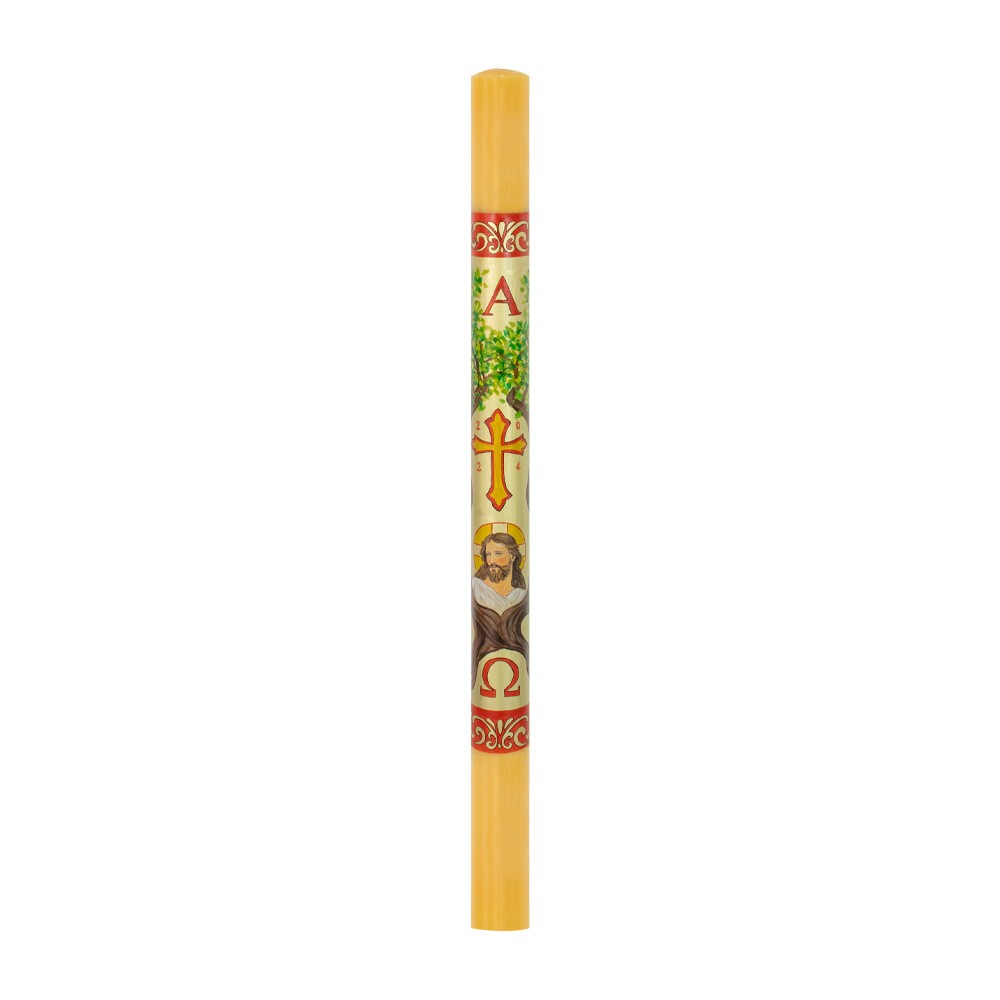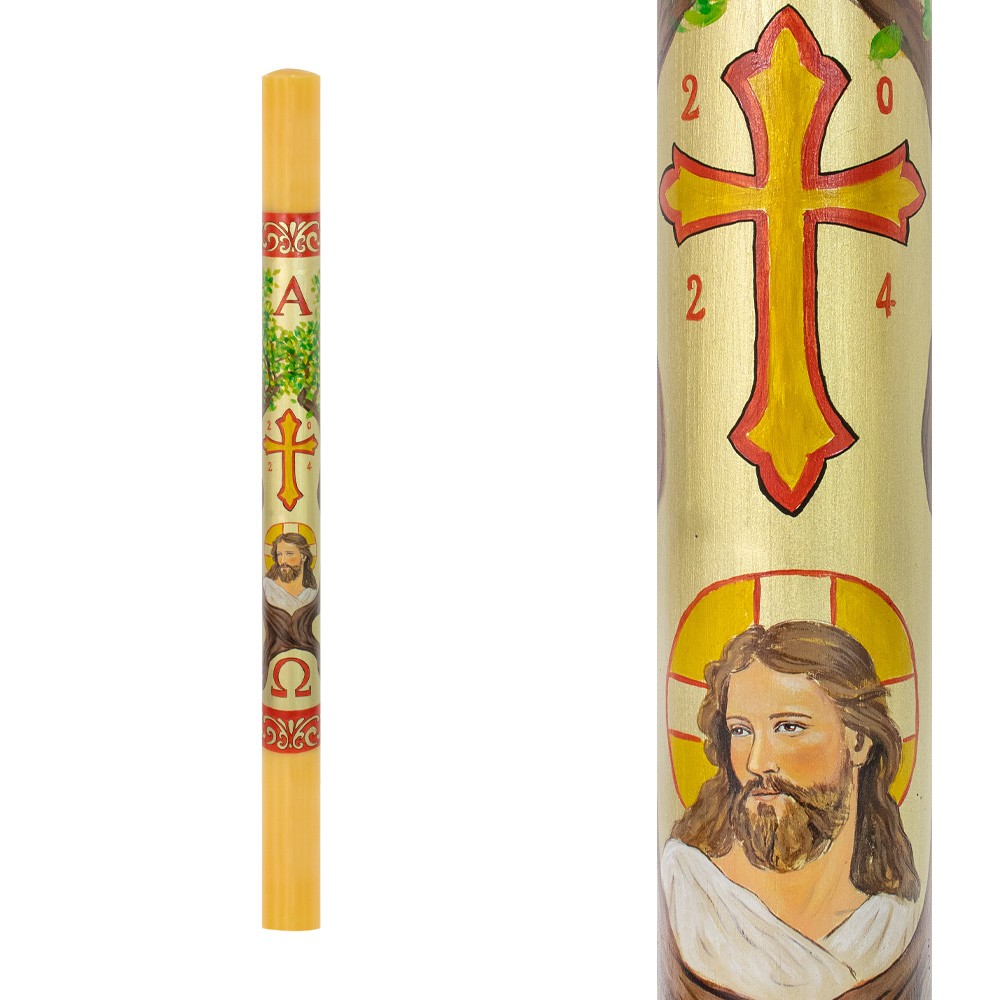 Each decoration of this liturgical candle is finely handpainted with delicate colors. A particular feature is the image of Christ Pantocrator, the cross and the tree of life.