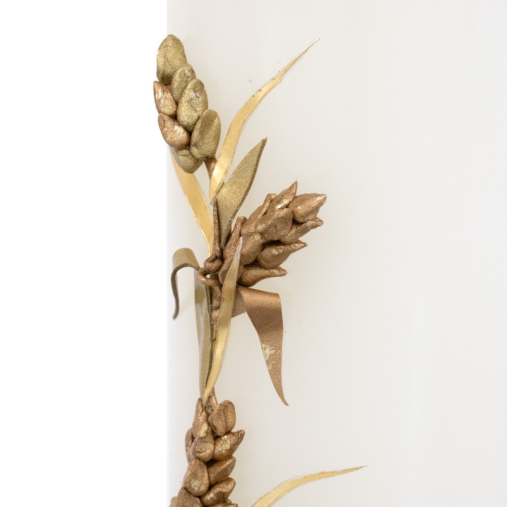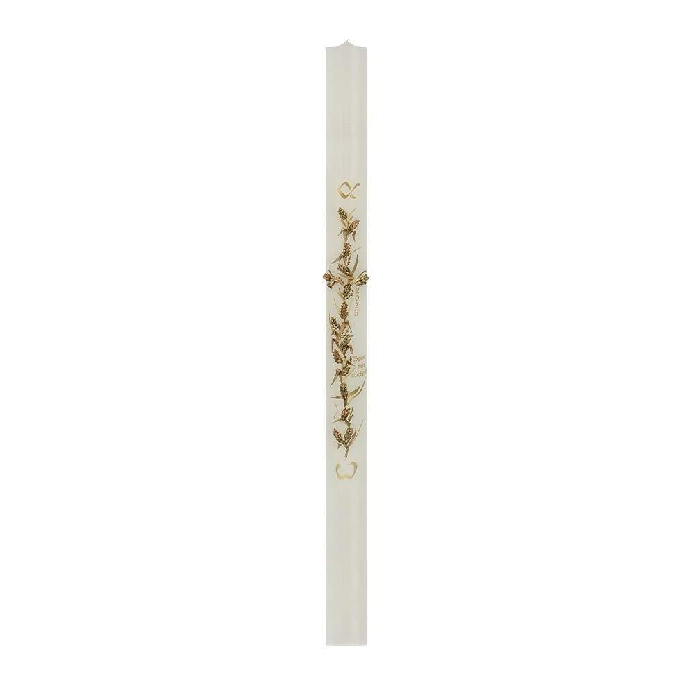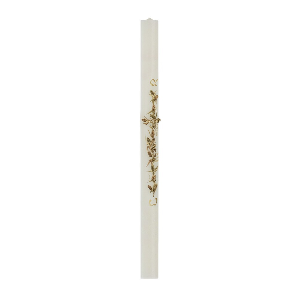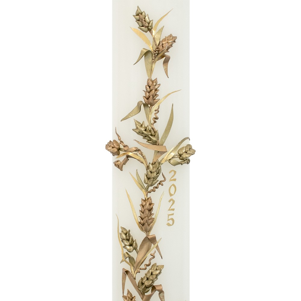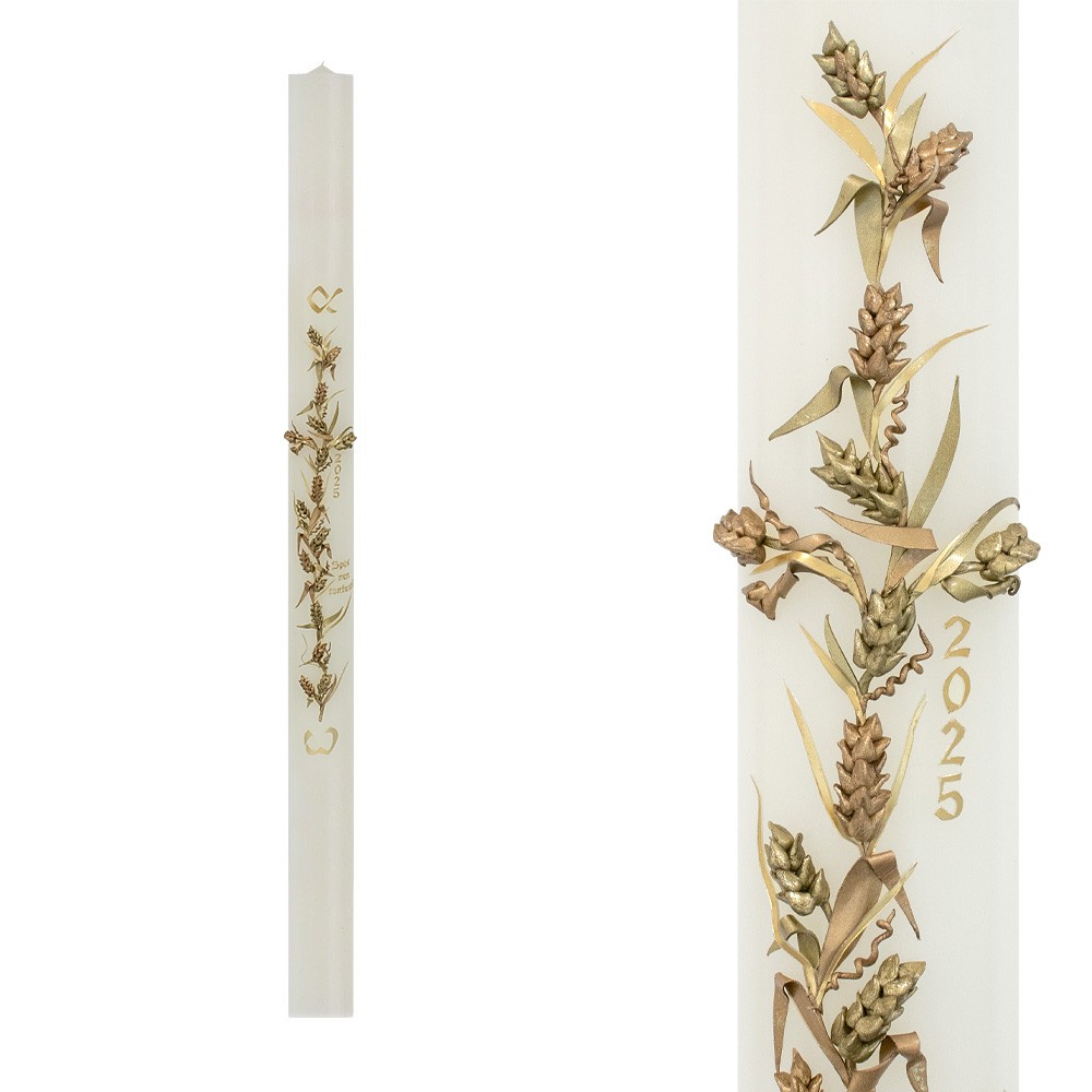 The 2025 Paschal Candle is crafted from top-quality white wax, ideal for liturgical celebrations. It is decorated with finely hand-painted images and raised details, including a cross with raised ears of wheat and the current year.