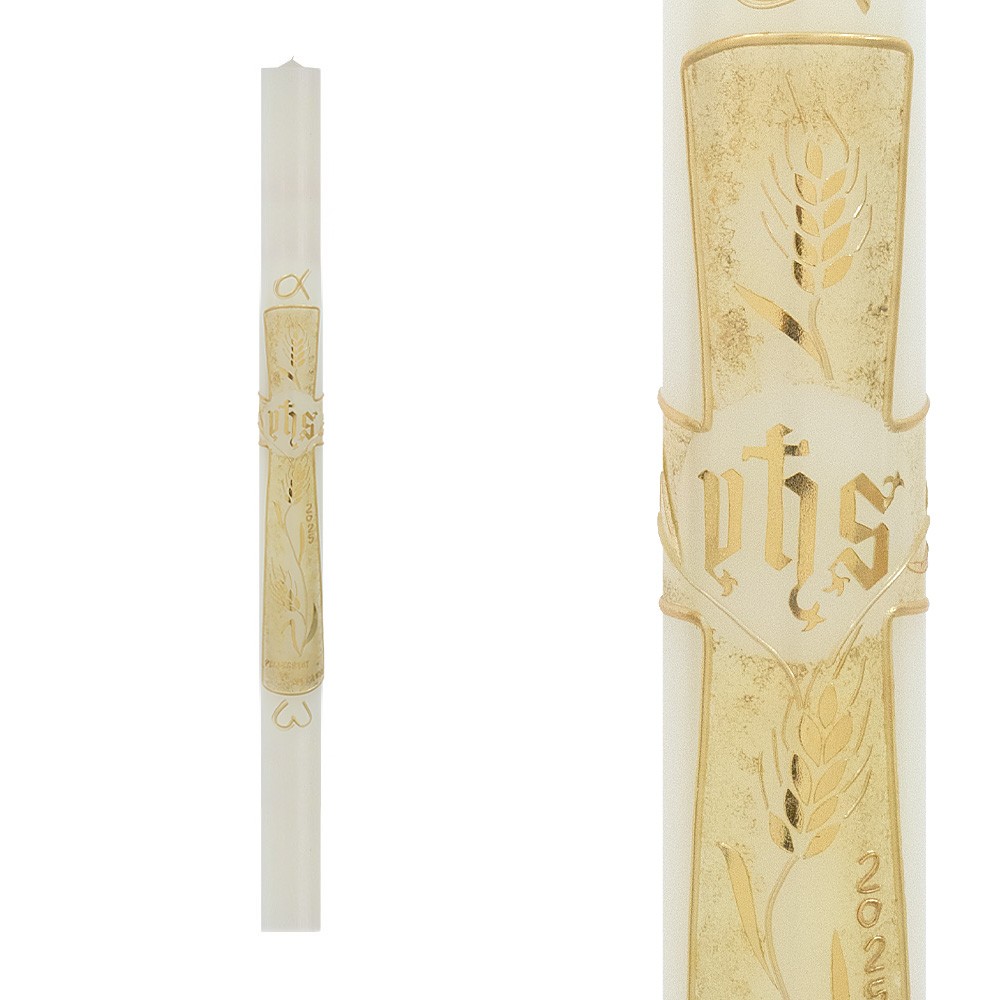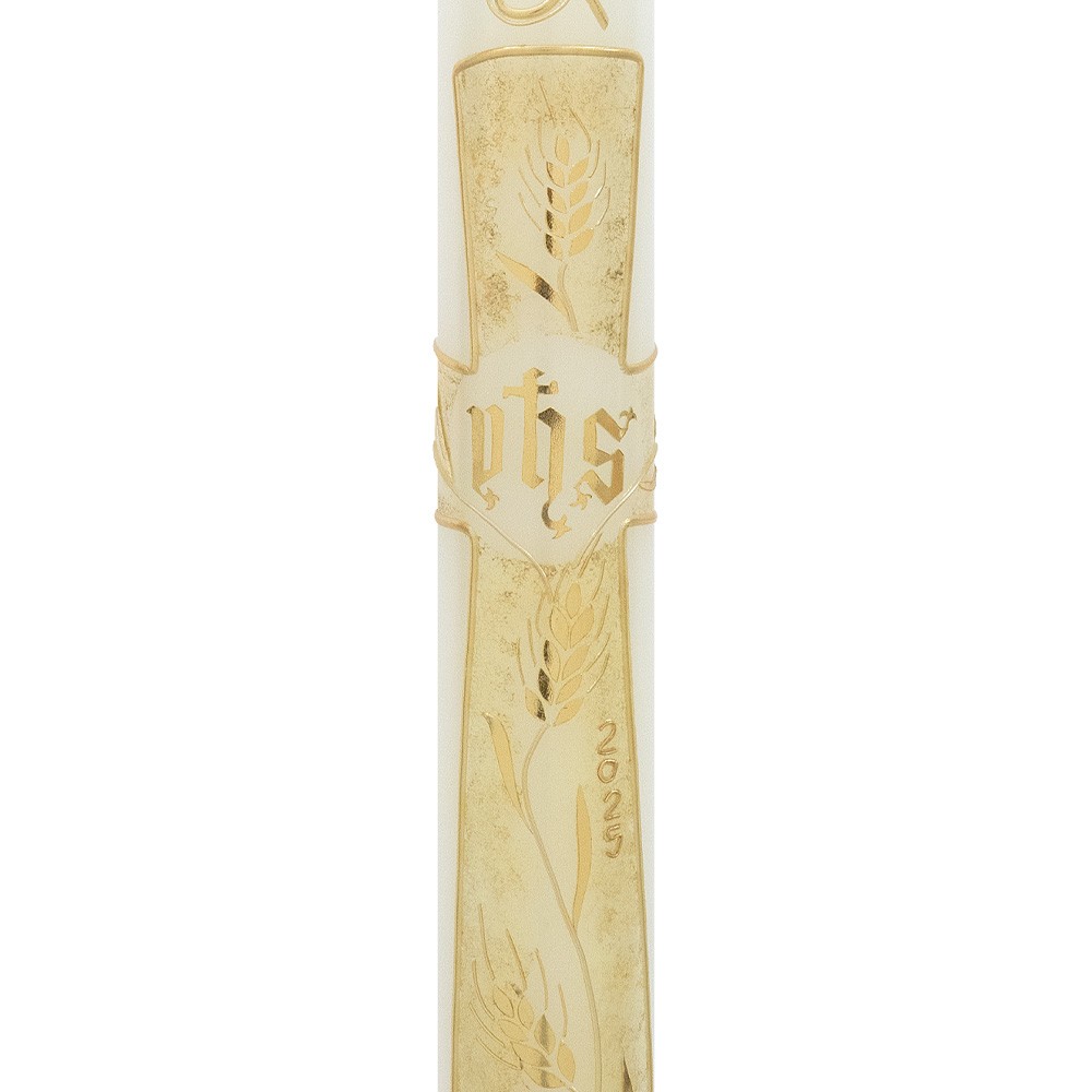 This Paschal Candle is made of white wax and entirely hand-painted. The decorations feature a cross on a golden background, enriched with wheat and the current year, making it ideal for liturgical celebrations.