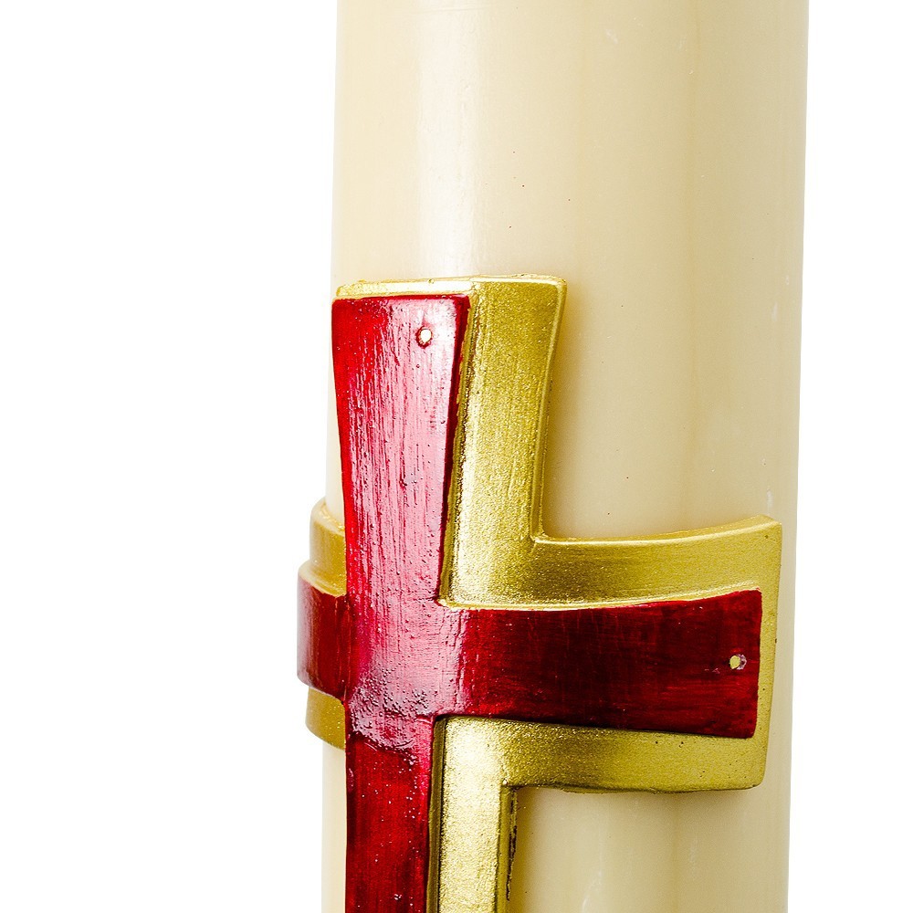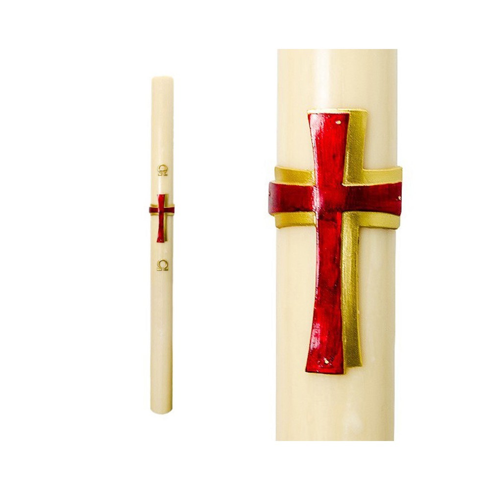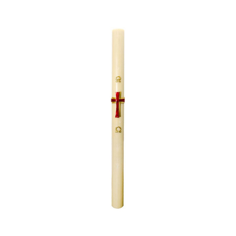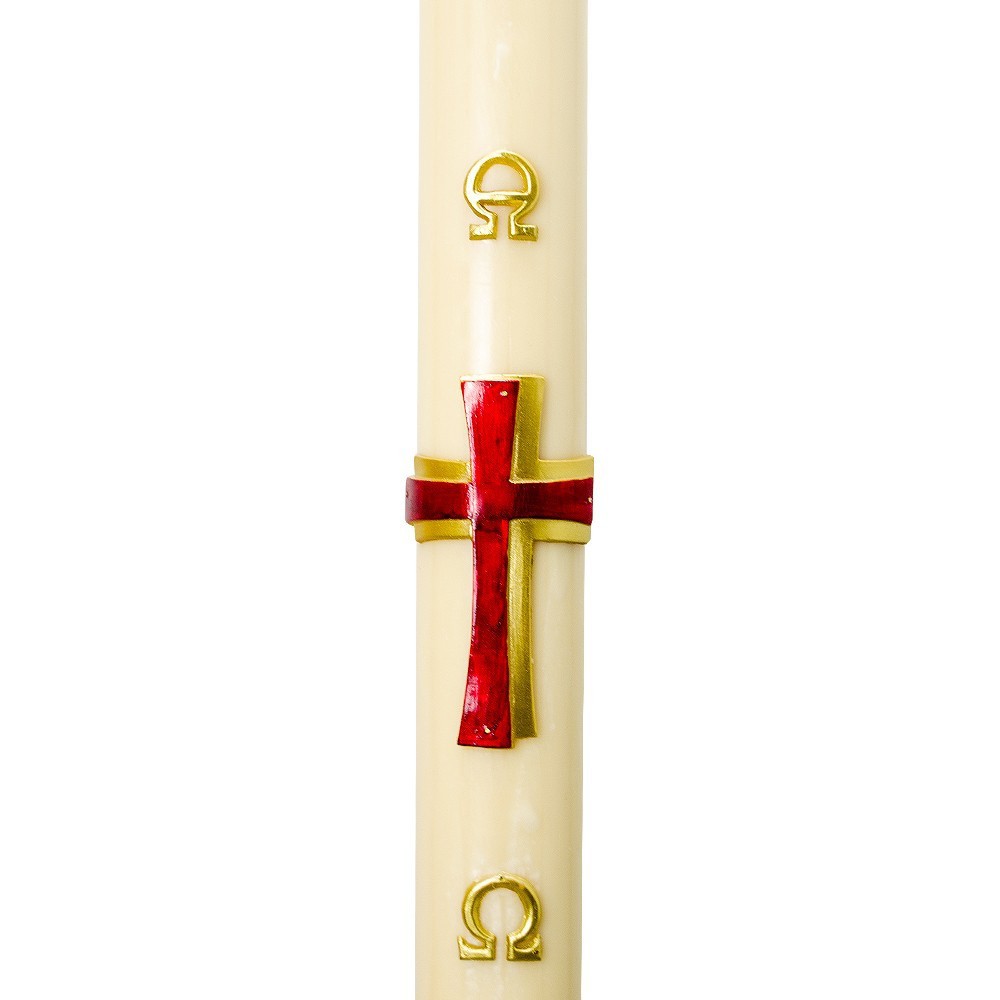 Paschal candle made of finest quality beeswax by an Italian manufacturer. It features relief decorations of the Alpha and Omega symbols, Cross in red and gold, current year.