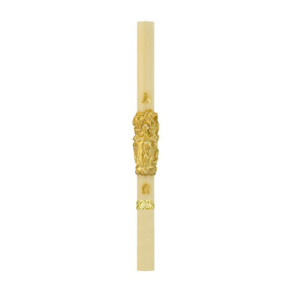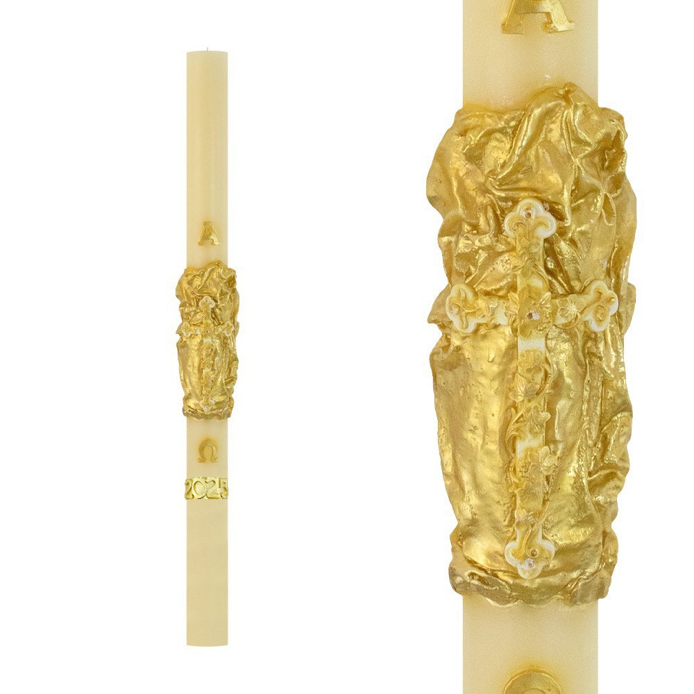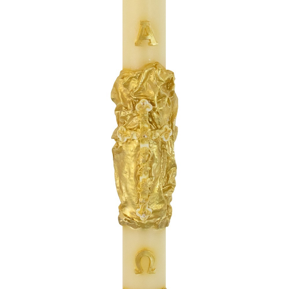 This Paschal candle made of finest quality paraffin features relief decorations. The golden decorations are handcrafted and depict a cross, Alpha and omega letters and the current year.