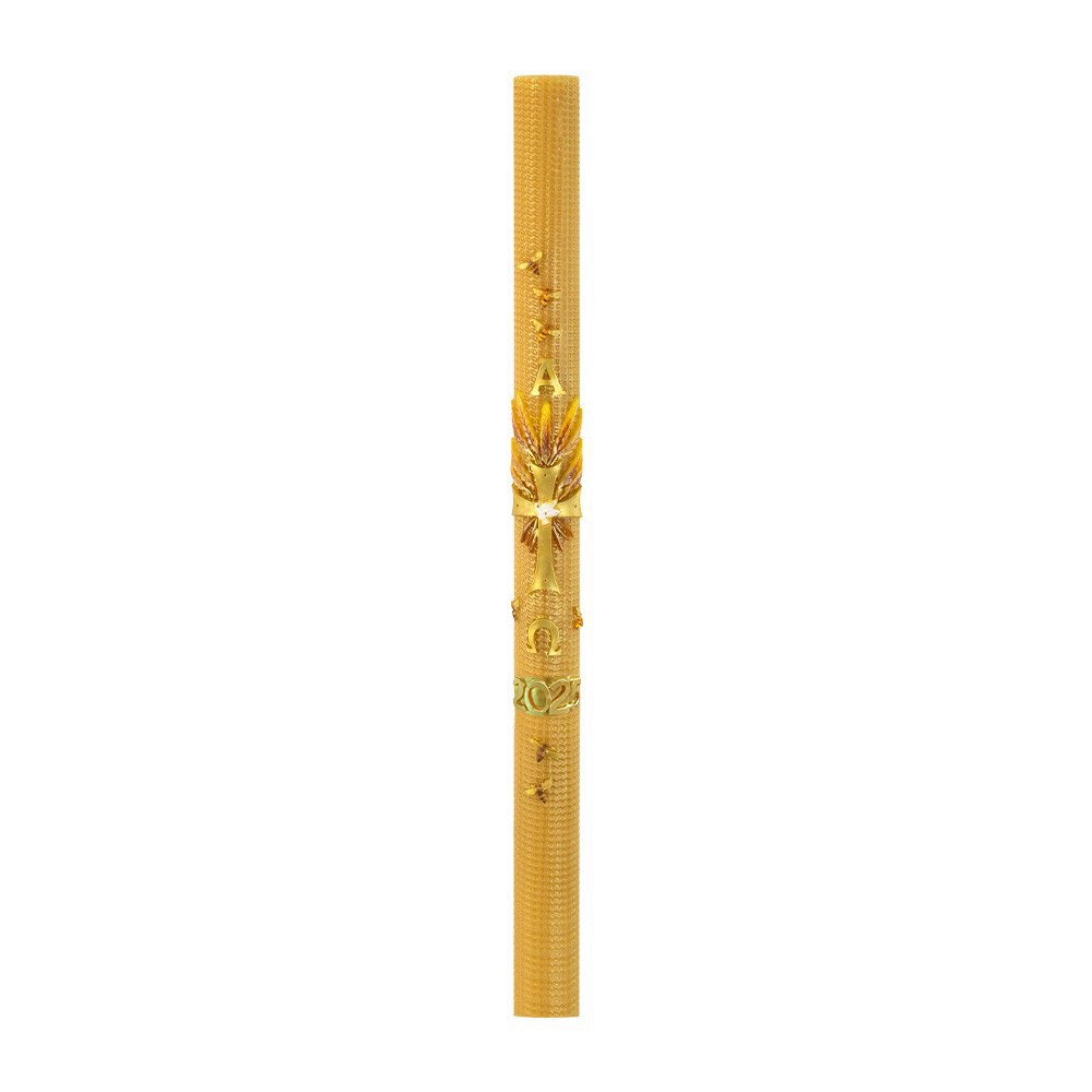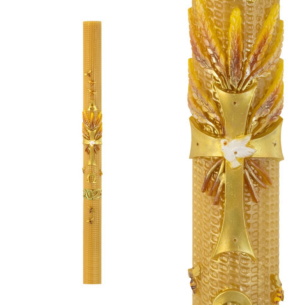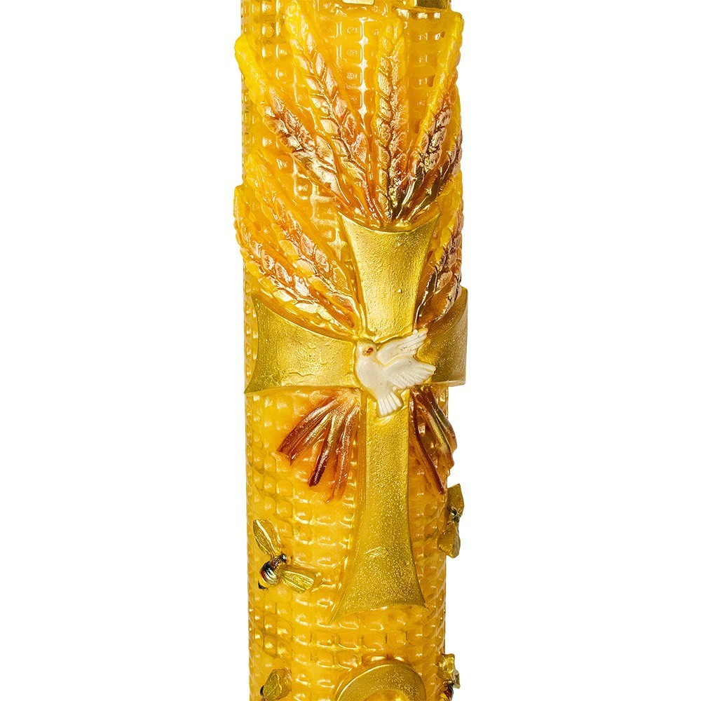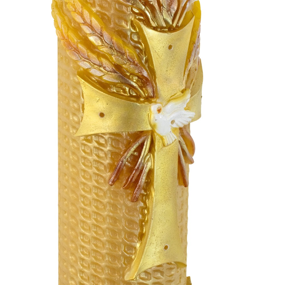 The candle features exquisite embossed decorations, including a Cross with a central Dove, surrounded by wheat, bees, Alpha and Omega, and the current year. This liturgical candle is smoke-free, retains its shape, uses minimal wax, and releases a subtle fragrance.