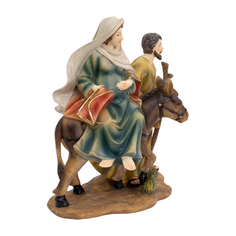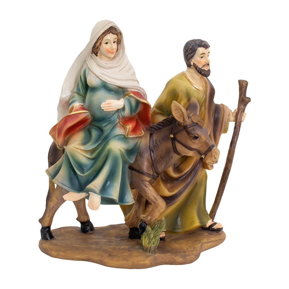 Statue with fixed base depicting Joseph and pregnant Mary looking for accommodation in Bethlehem for the birth of Baby Jesus.