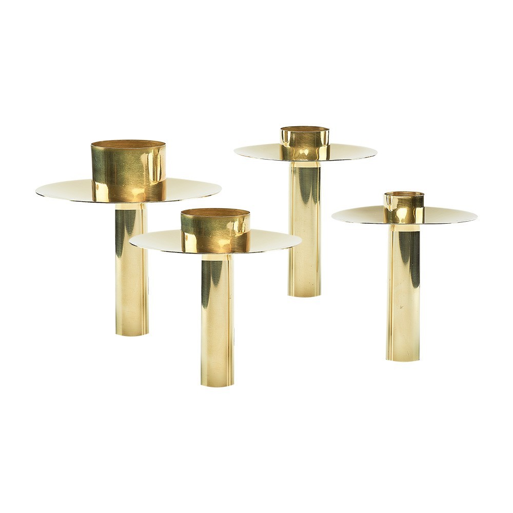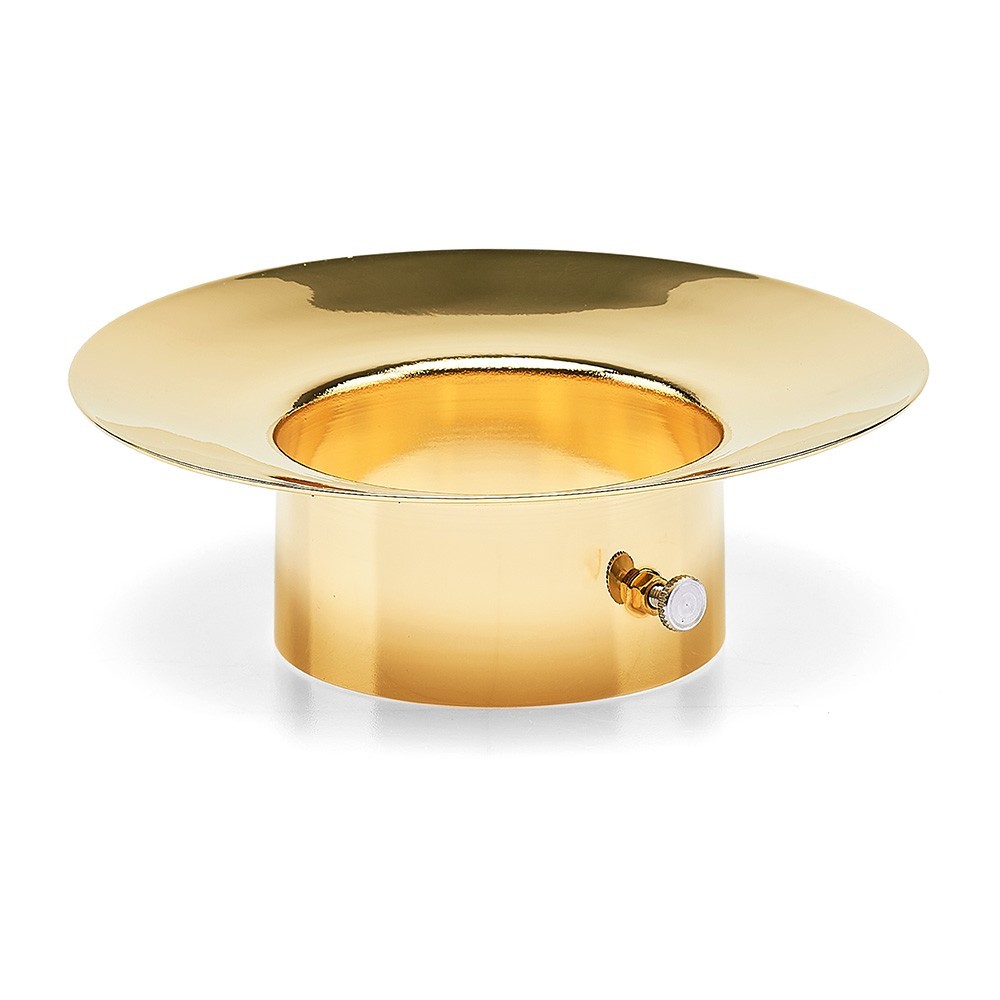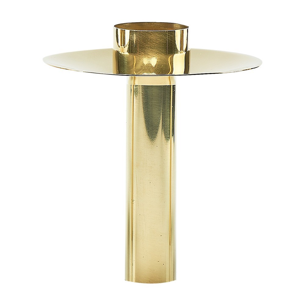Candle holder in polished golden brass, complete with wax drip pan with a diameter of 12 cm or 15 cm. You have the option to insert a wooden handle (not included) if needed.