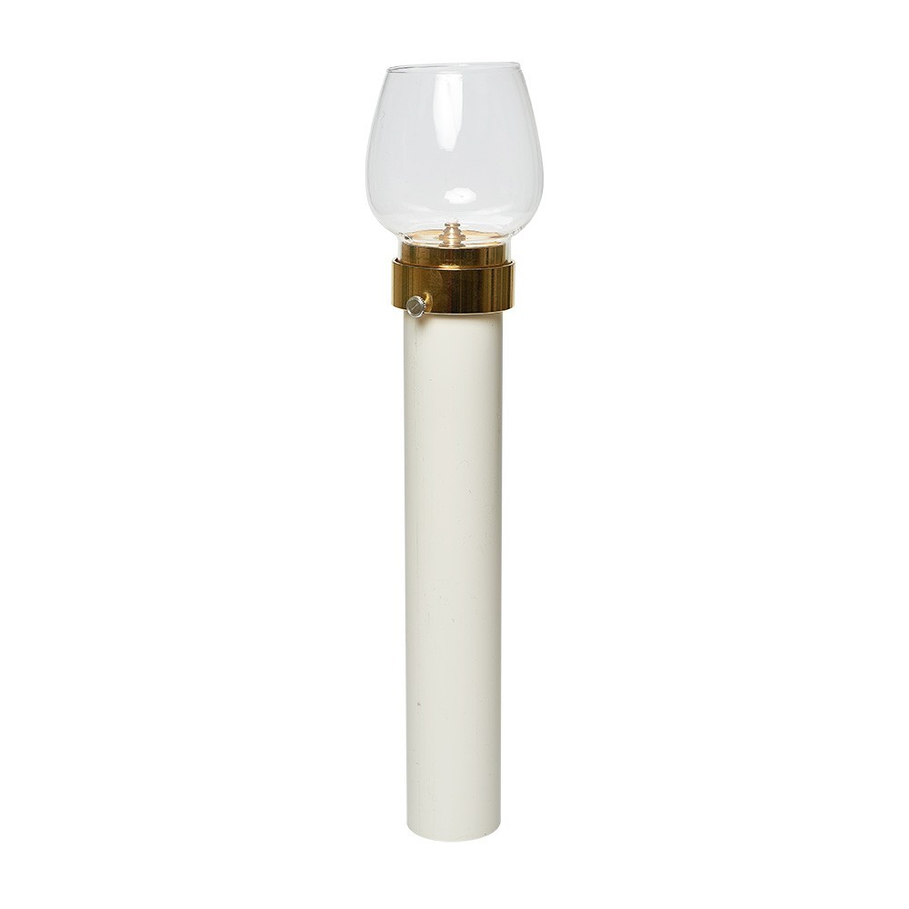 Processional torch for liquid wax. This torch is fueled by liquid wax and comes with a liquid candle (diameter 5 cm), a glass cartridge and windproof glass.