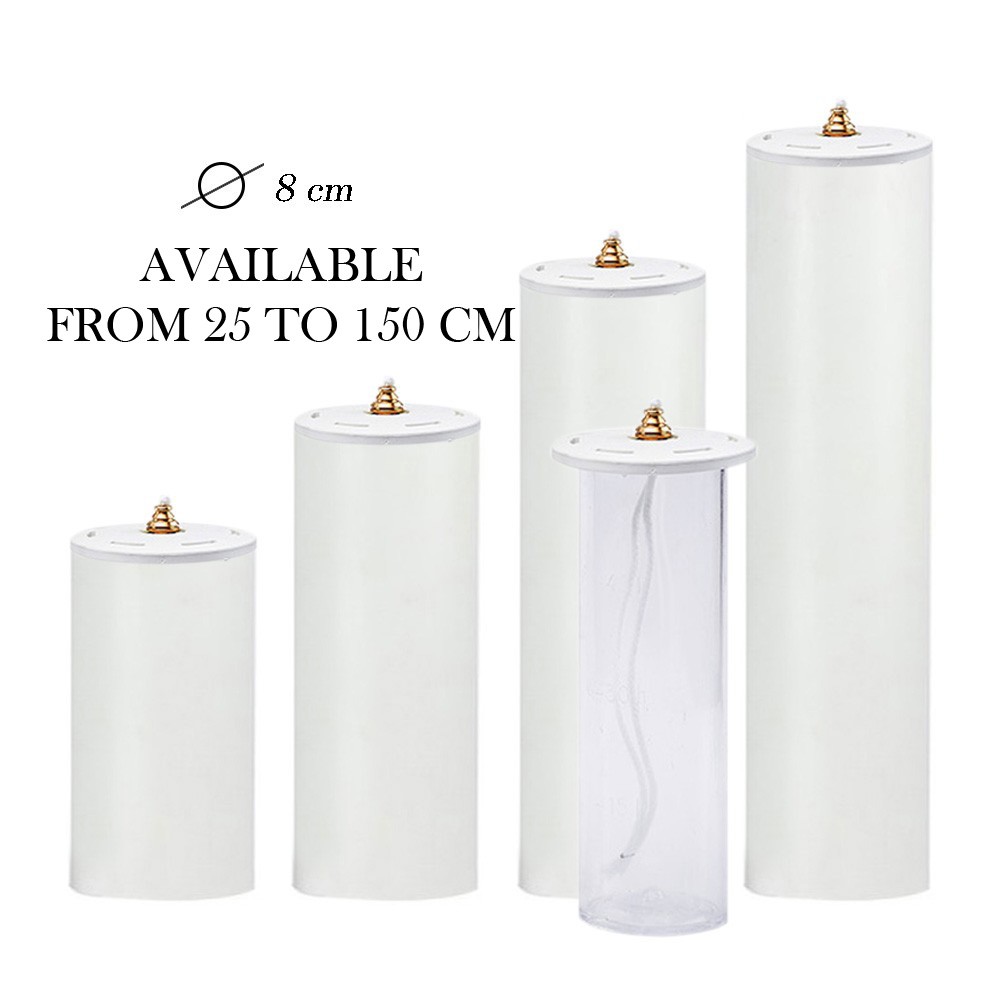 Liquid candle in PVC. The candle is 8 cm diameter. It is complete with filter, wick and wick holder in brass.