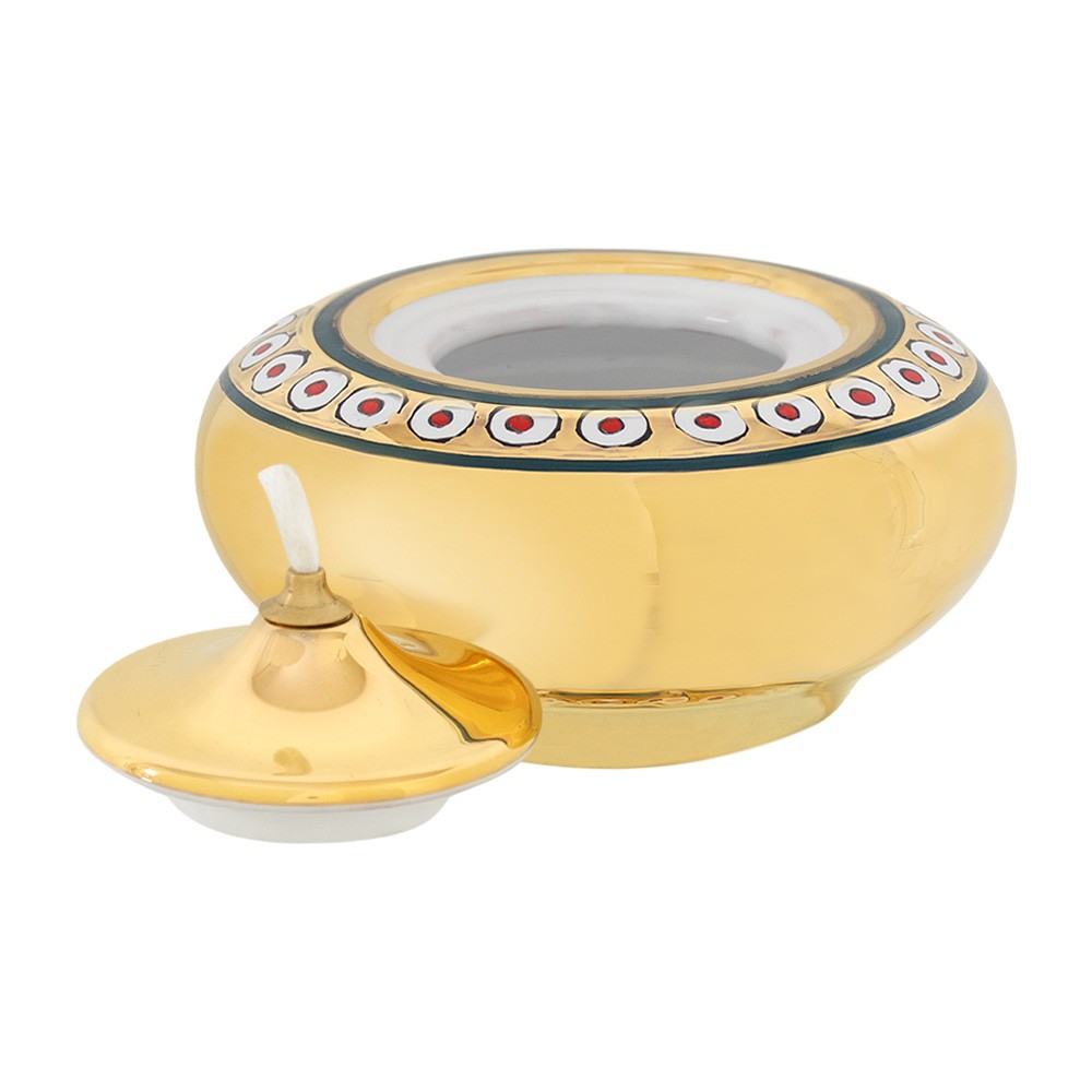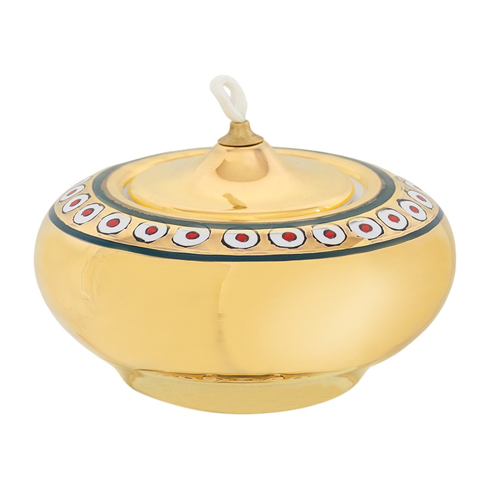 This lamp for liquid wax is suitable for liturgial use. Entirely made of ceramic and finely painted by HAND. It comes with a wick and wick holder in brass.