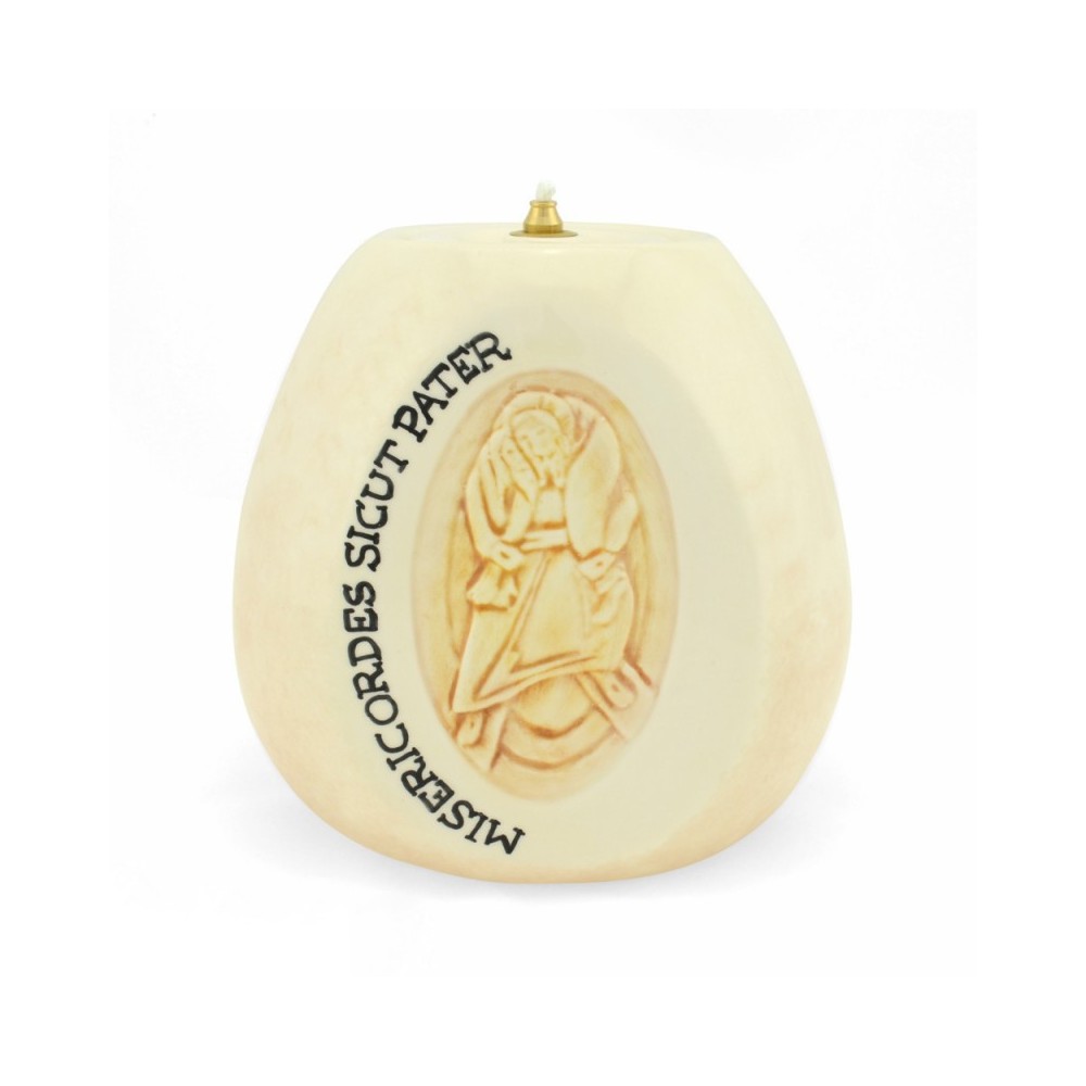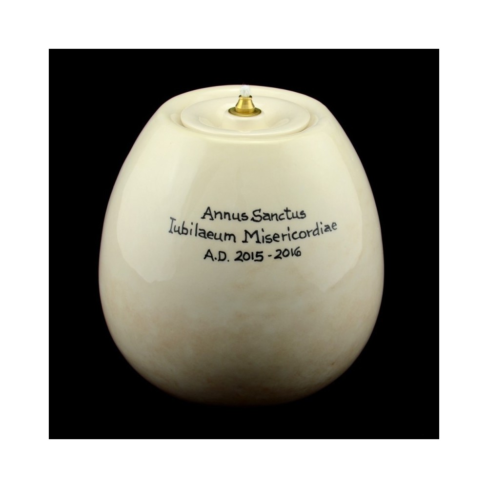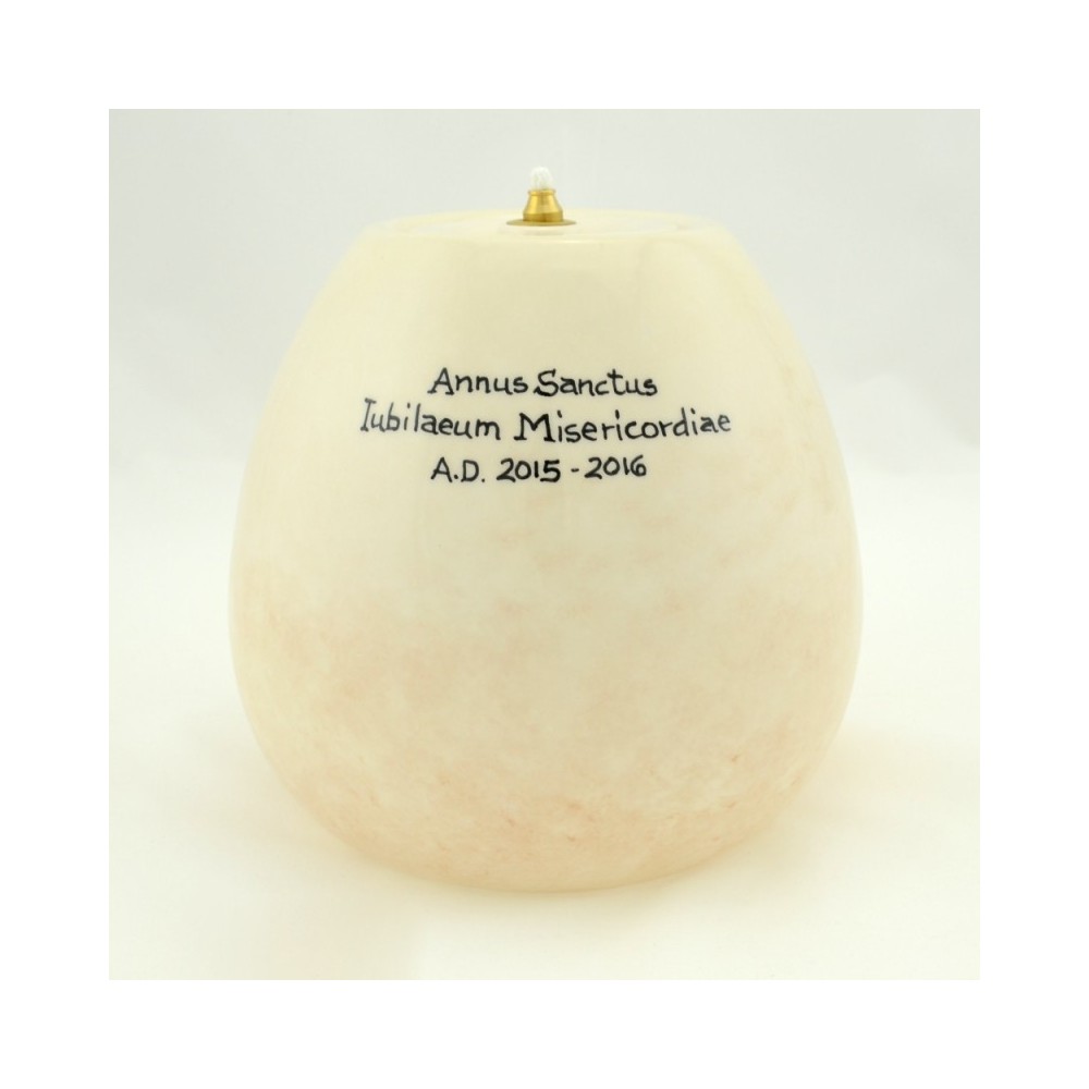 Suitable for liquid wax. It features the embossed logo of the Jubilee of Mercy. Complete with golden brass wick. This product is entirely made in Italy.
