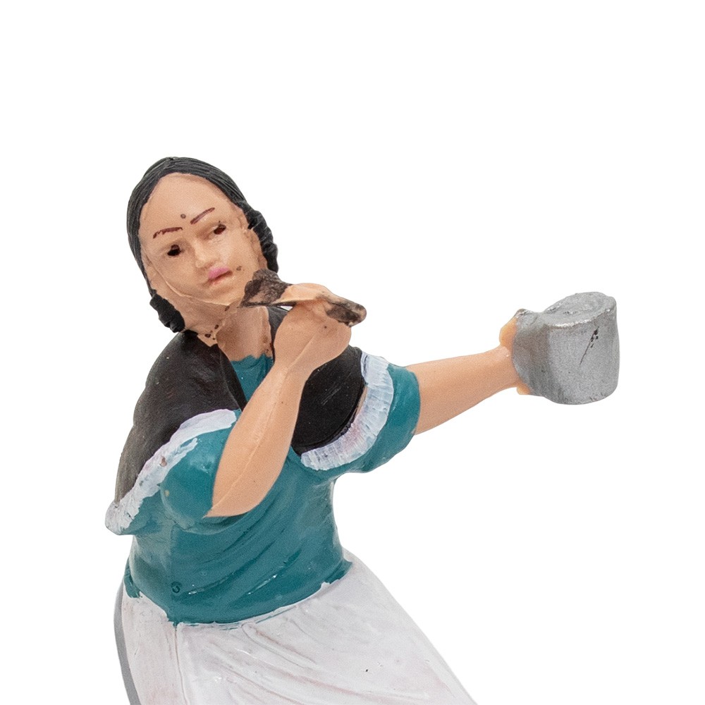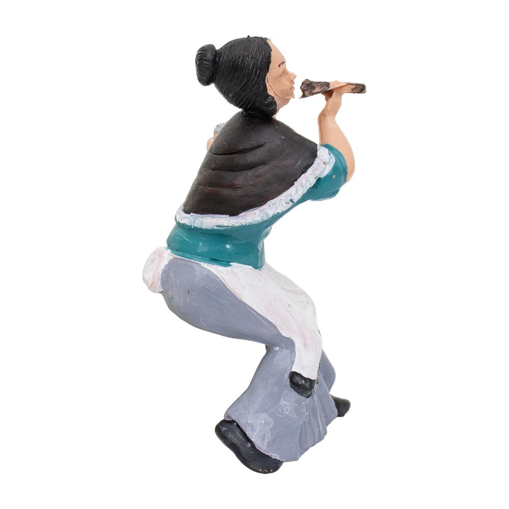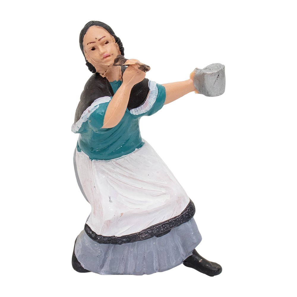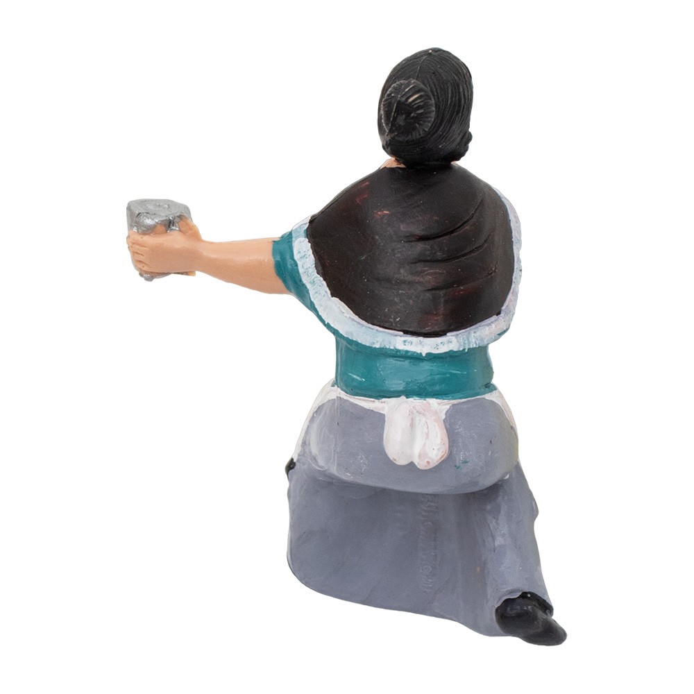 Sitting shepherd eating. She is holding a glass in one hand and a spoon in the other. Suitable for Euromarchi Nativity scenes with a maximum height of 10 cm.