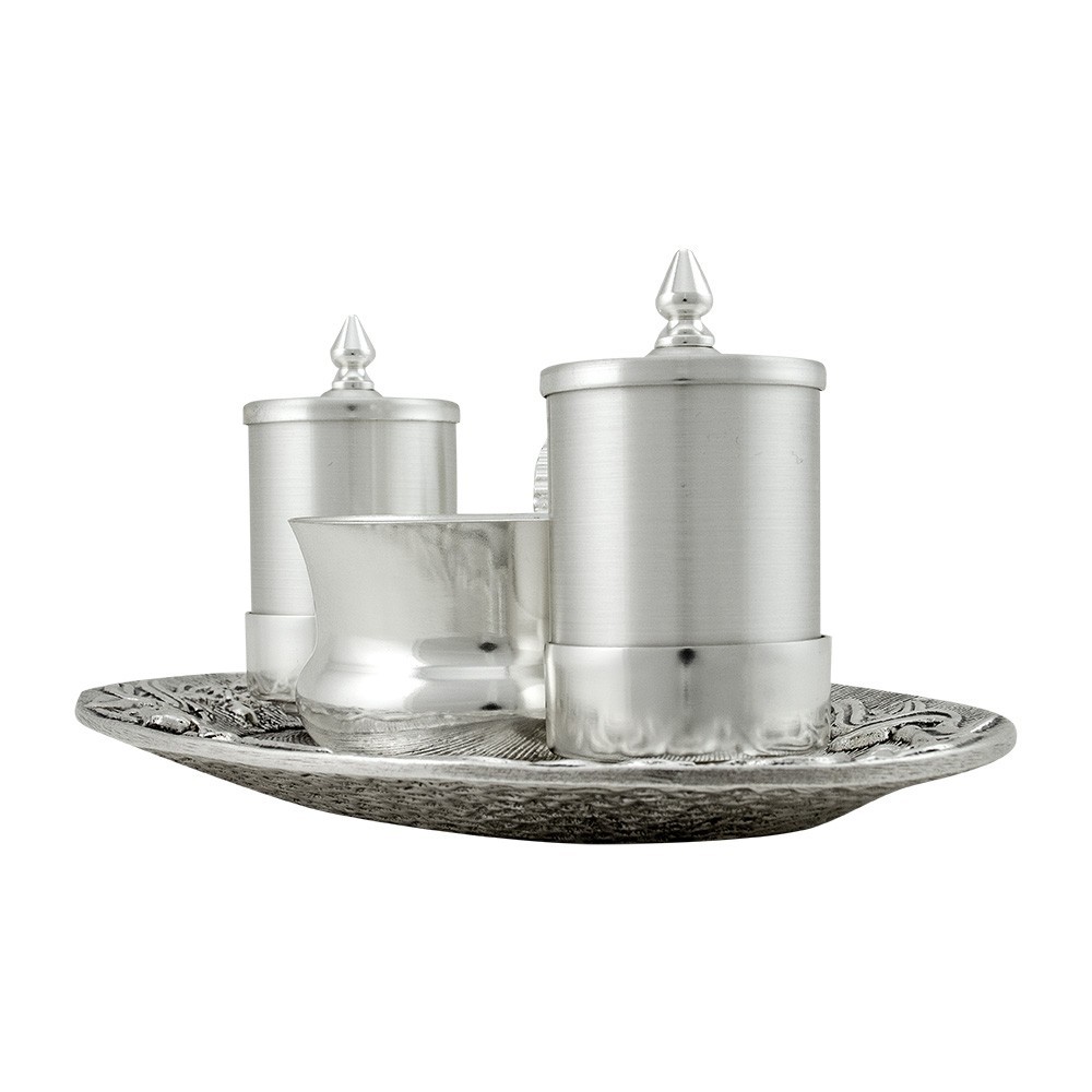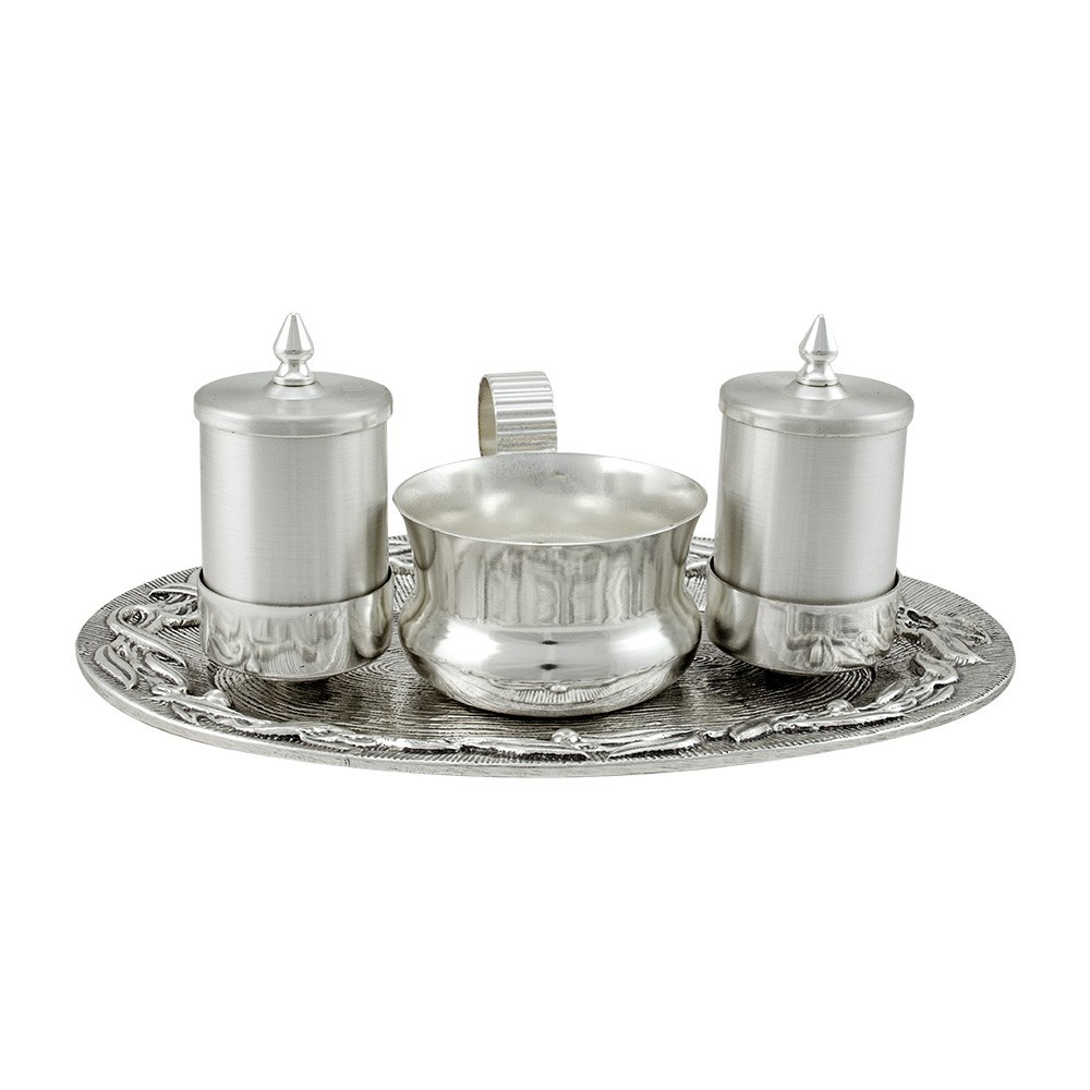 Complete set for the rite of Baptism made of silver brass. Decorated with a weave of olive tree leafs motif in relief. The set includes cups for Holy oils and jug for water.