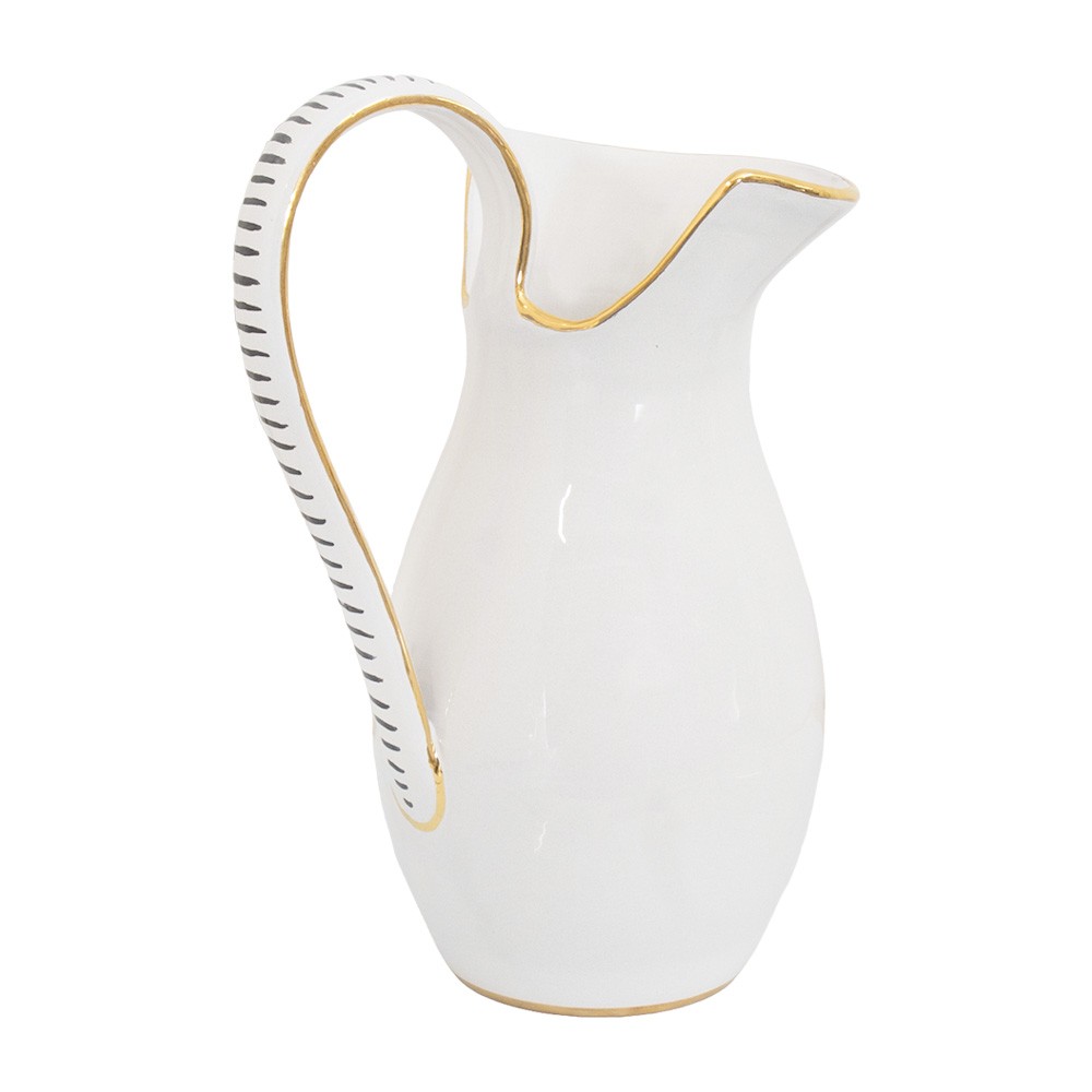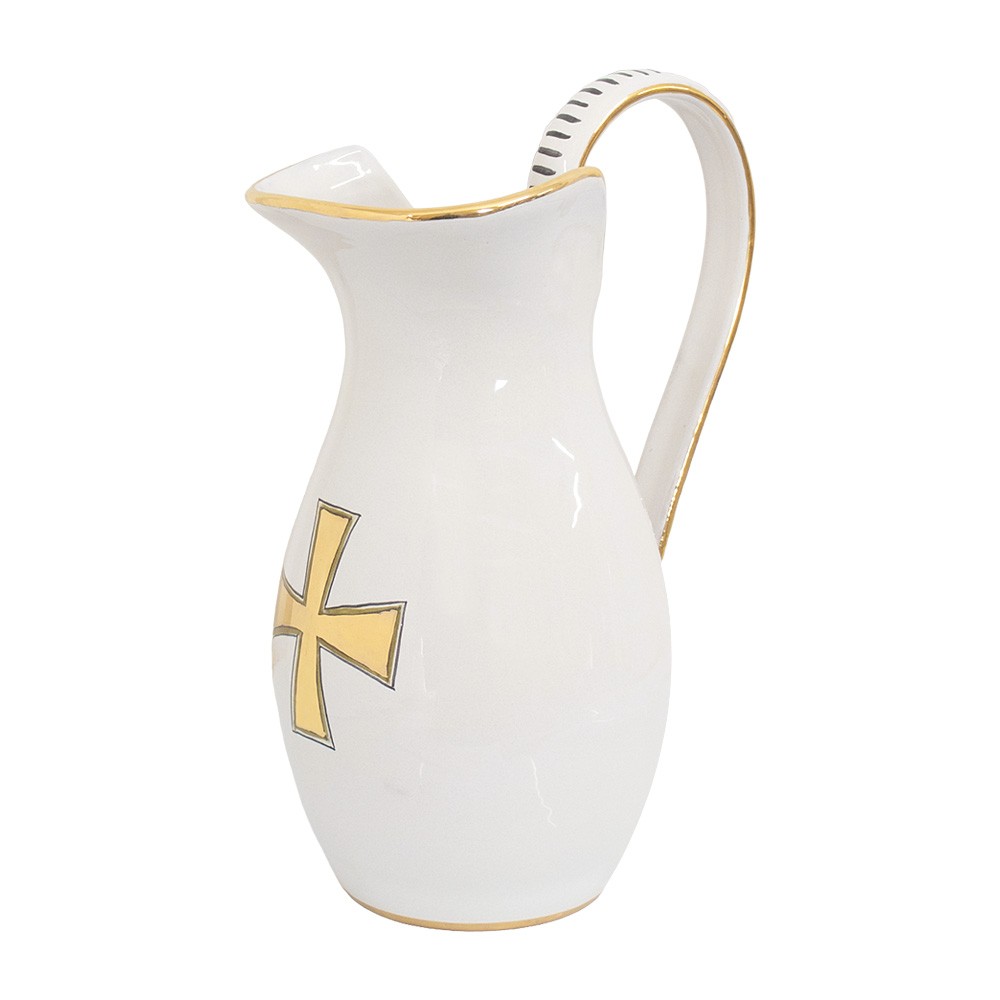 Liturgical ewer in ceramic, entirely handpainted in gold and white with cross.