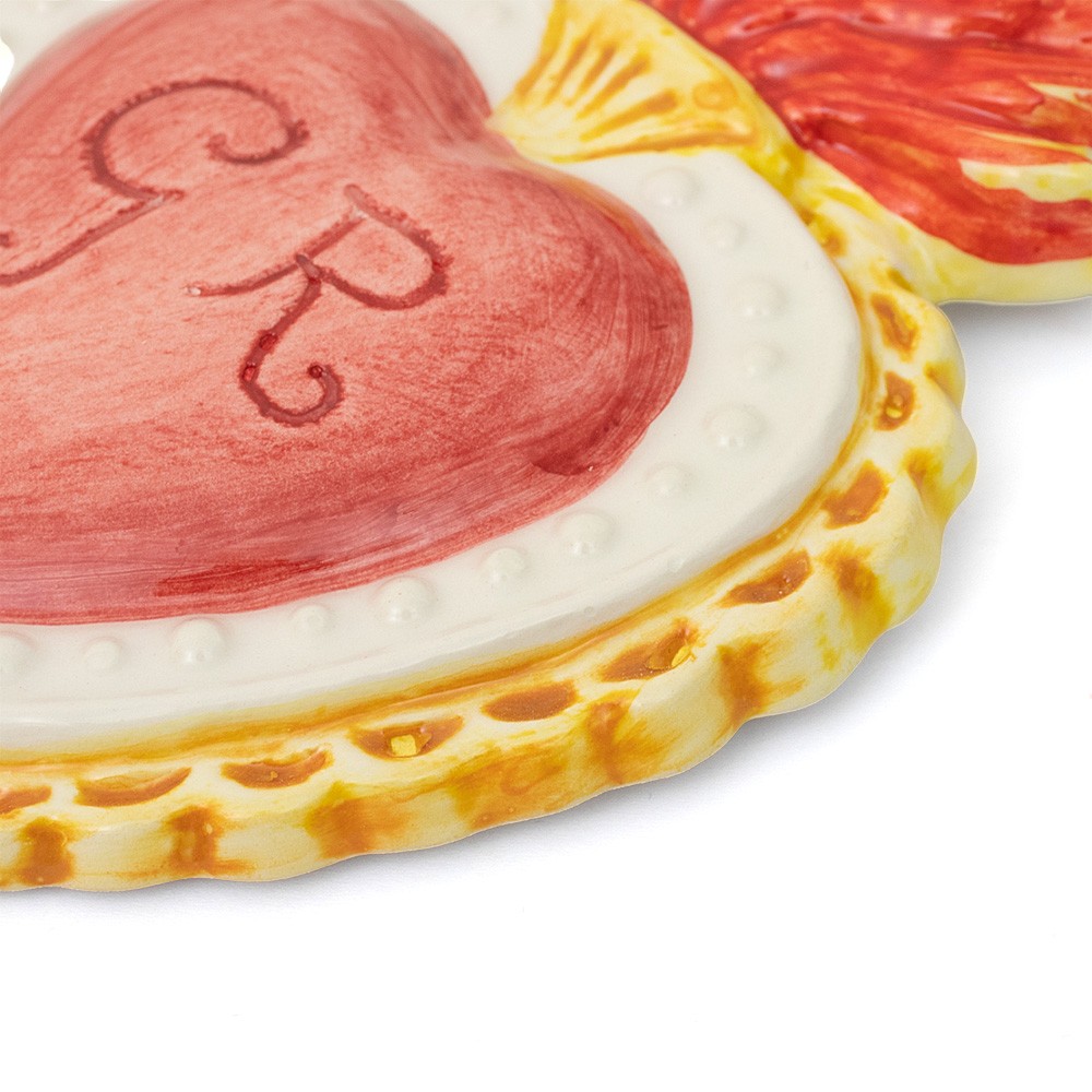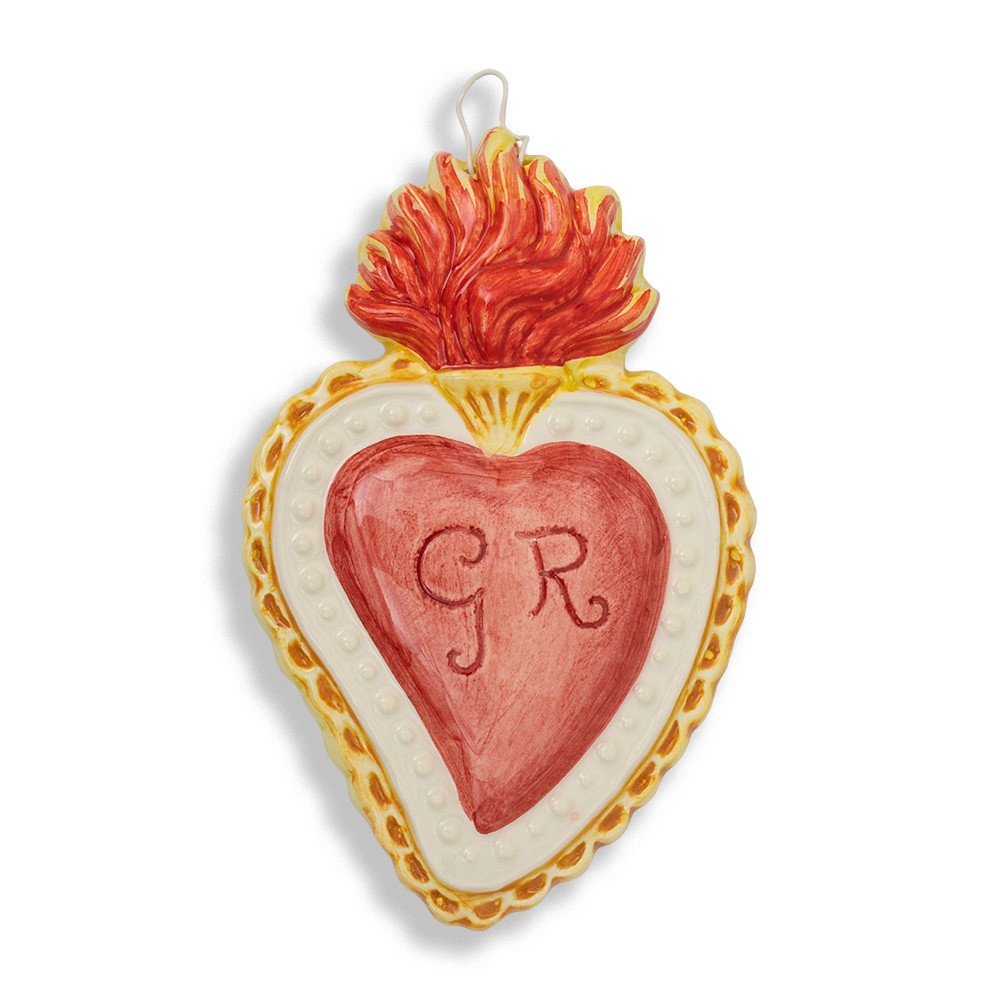 Ex voto heart made of white and colorful ceramic. In the middle of the heart is an engraving depicting the initials GR (Grace Received).