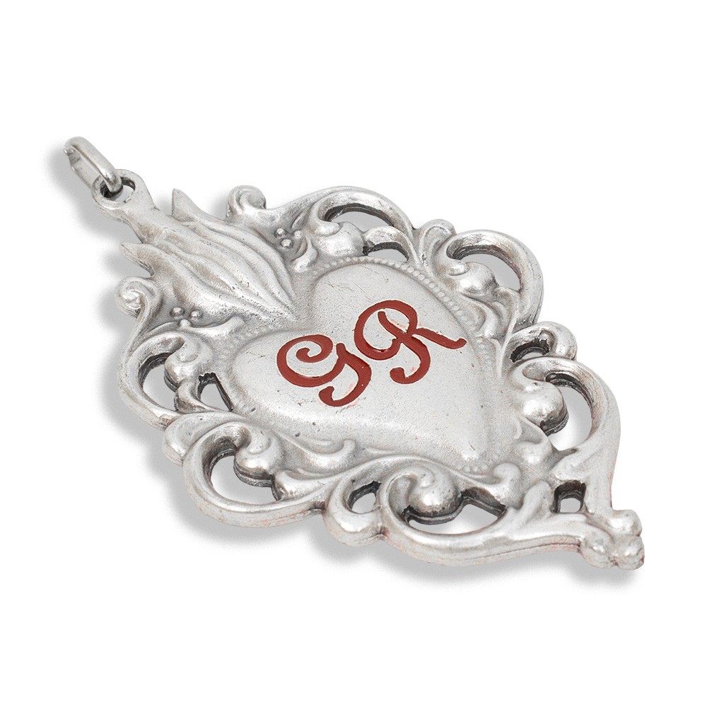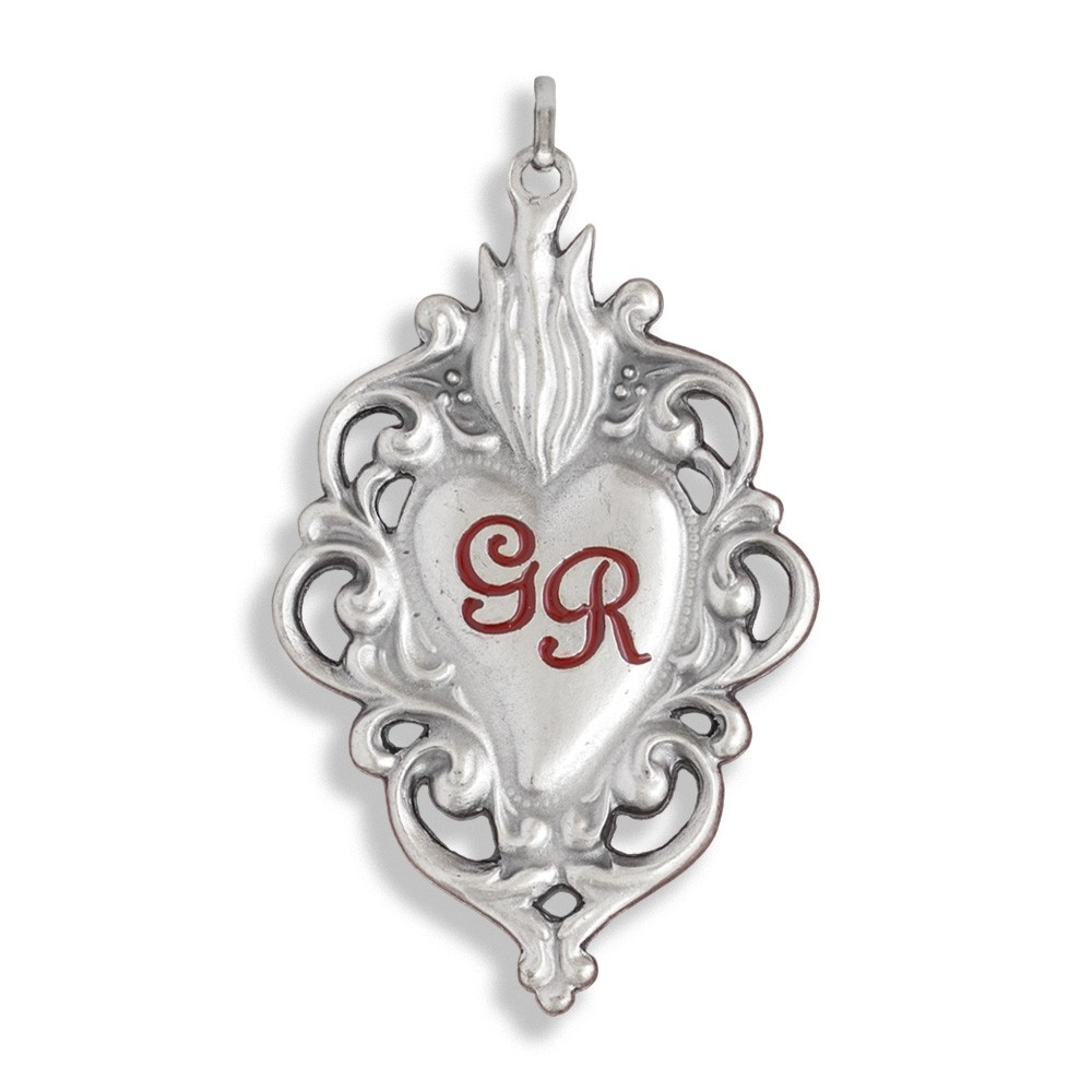 In the middle of the heart is an engraving depicting the initials GR (Grace Received) enameled in red.