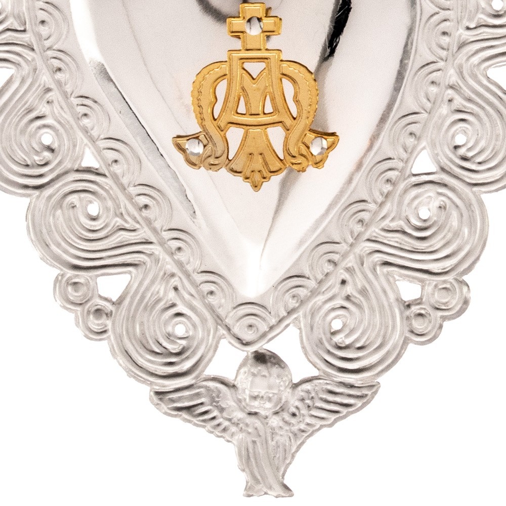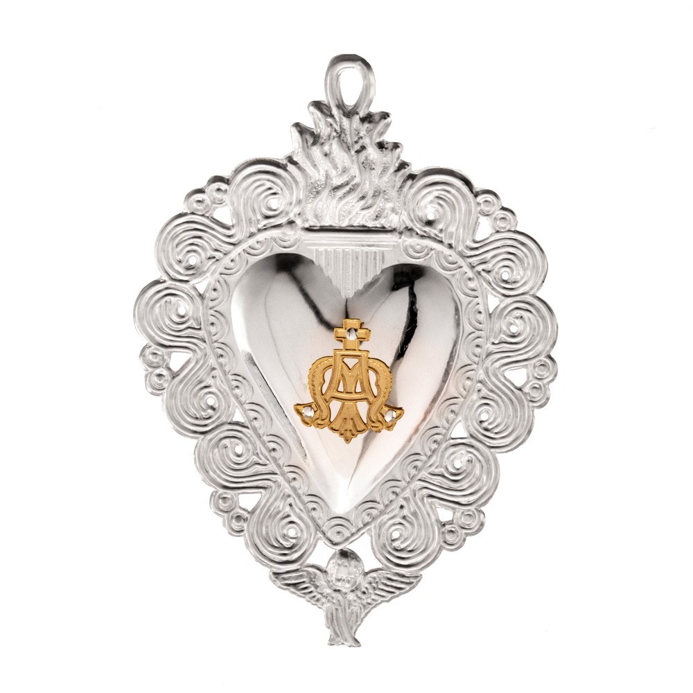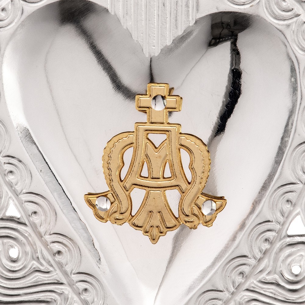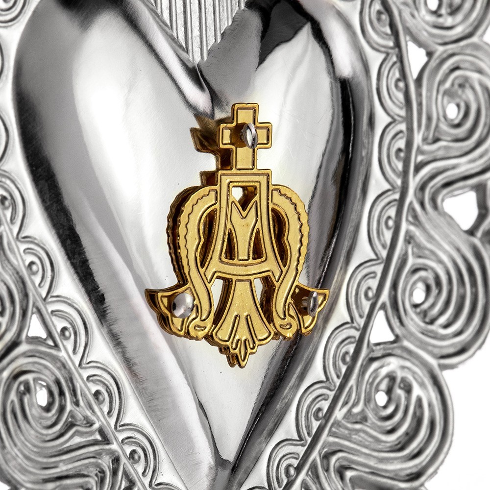 Votive heart in silver with Marian emblem.
