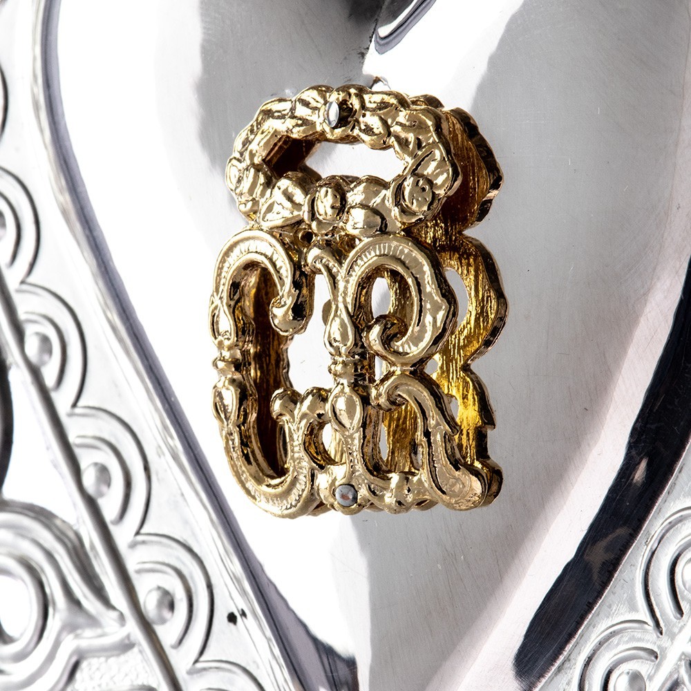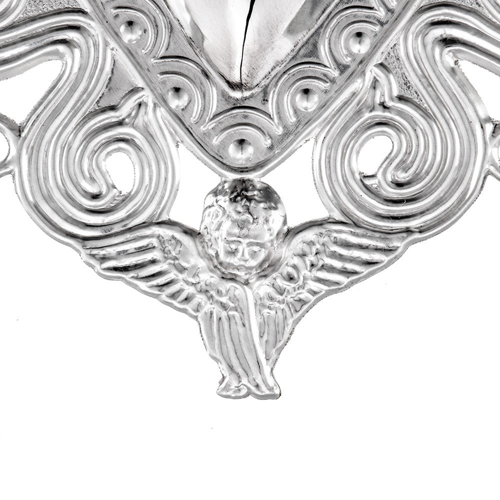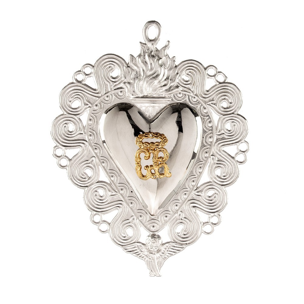 Ex voto in metal with flame and angel. In the middle of the heart are the GR (Grace Received) initials in gold.