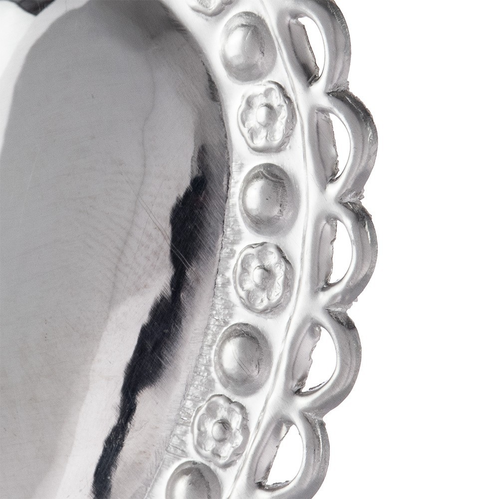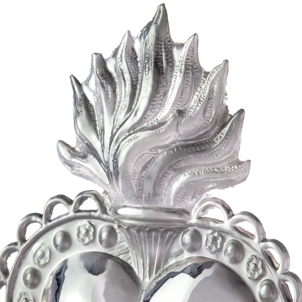 Ex voto in 925 silver depicting a smooth heart with flame and decorations. The votive heart is 15 cm and 10 cm wide.