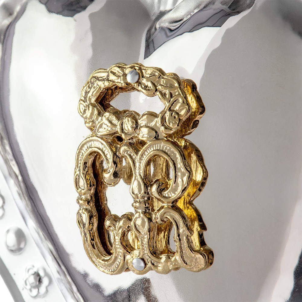 This ex-voto heart is crafted with a filigree border and features a flame, flowers and angel. On the smooth heart are the GR (Grace Received) initials in gold. Product of excellent quality, made in Italy. This ex-voto is supplied in a gift box made of carboard.
