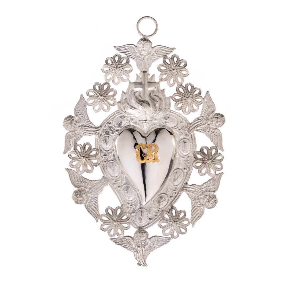 Ex-voto (approx. 19x12 cm) made of silver-plated metal with eight flowers, six angels and flame. On the smooth heart are the GR (Grace Received) initials in gold. Made in Italy. This ex-voto is supplied in a clear bag.