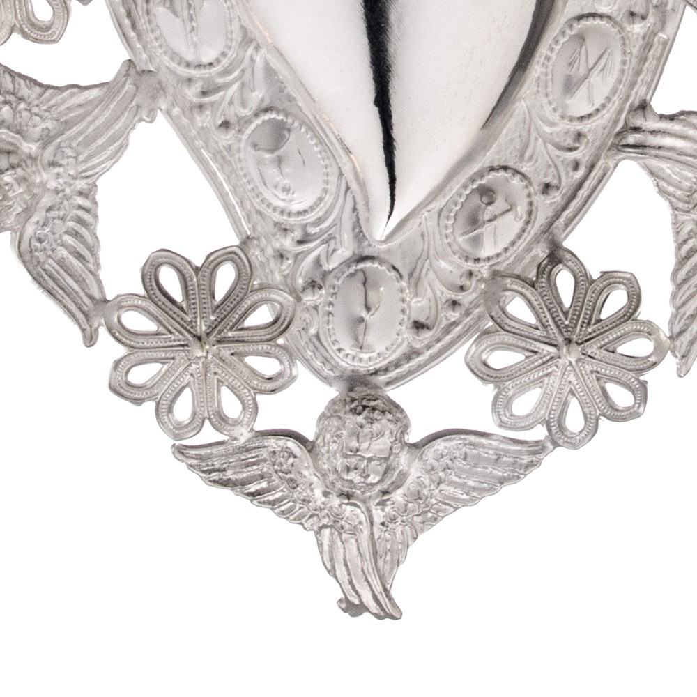Ex-voto heart in metal with angels and flowers.