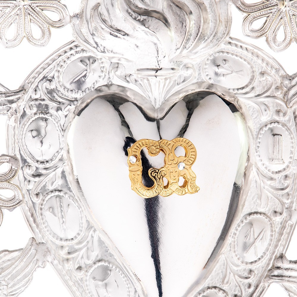 Votive heart in silver with Marian emblem.