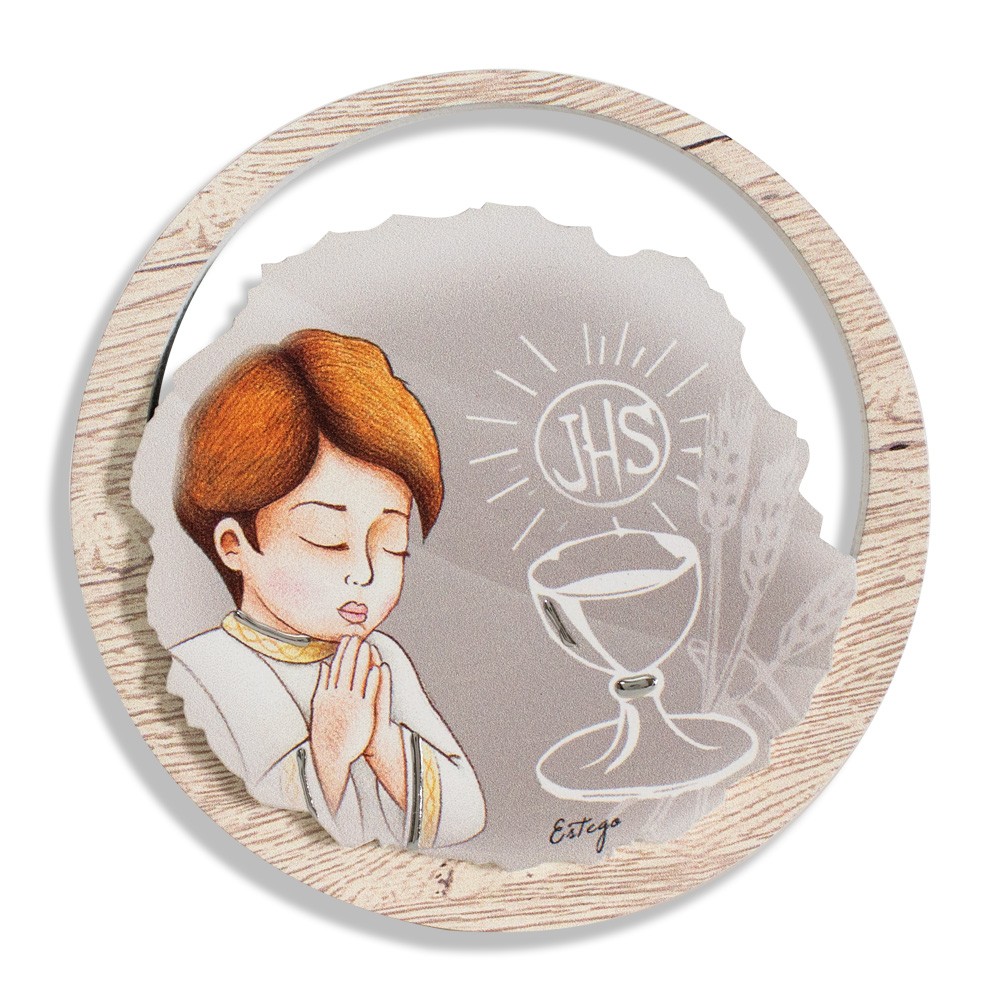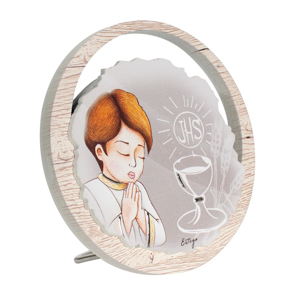 This round picture is in light wood with decorations in silver metal applied by hand.