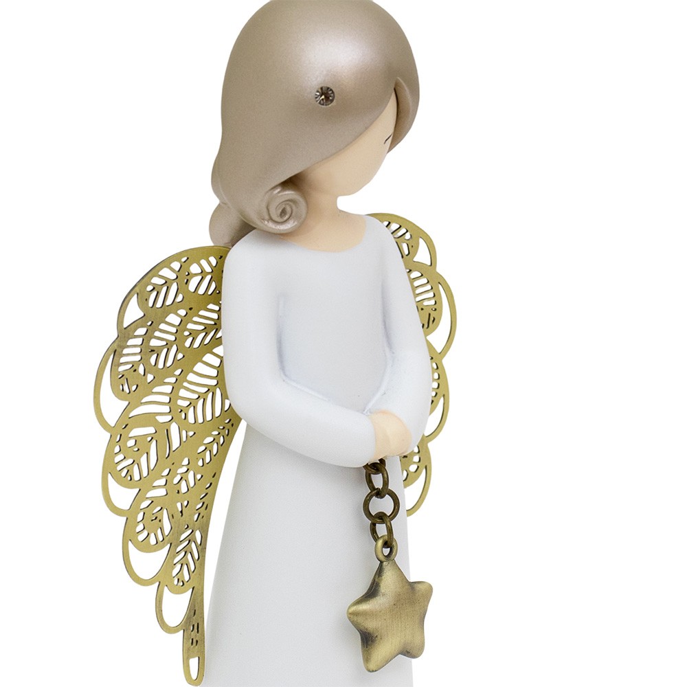 This charming figurine is meticulously hand-painted, crafted in resin with metal-colored wings and a star pendant, accented with a small rhinestone in the hair.