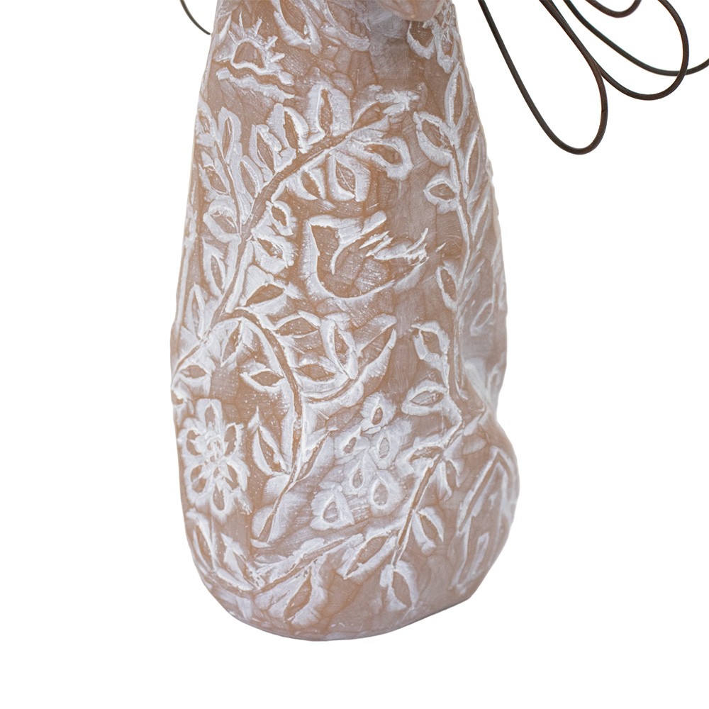 This figure depicts a tender angel of remembrance holding a golden heart close to the chest. This statue is entirely made of resin with a wood-like finish, whereas the wings are in metal.