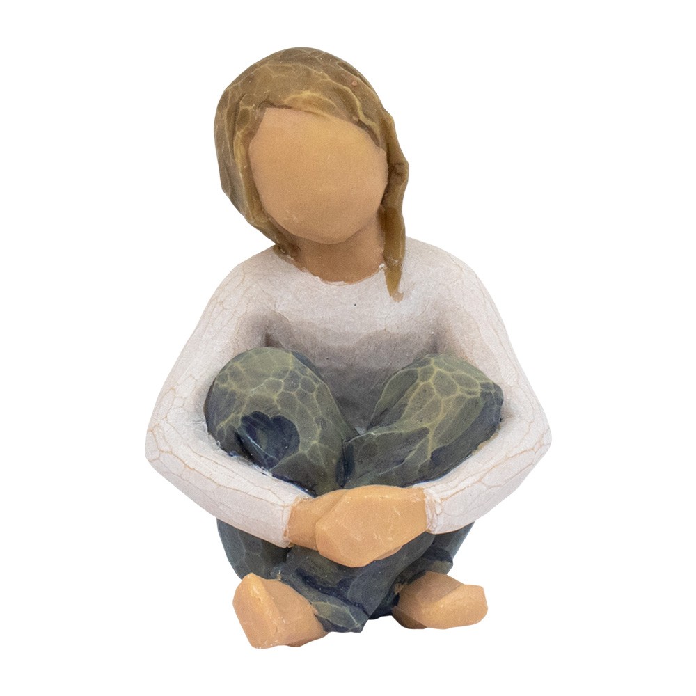 Spirited Child is a delicate statue from the Willow Tree collection, designed by artist Susan Lordi. Made of resin and hand-painted, it depicts a seated girl with crossed legs and arms.