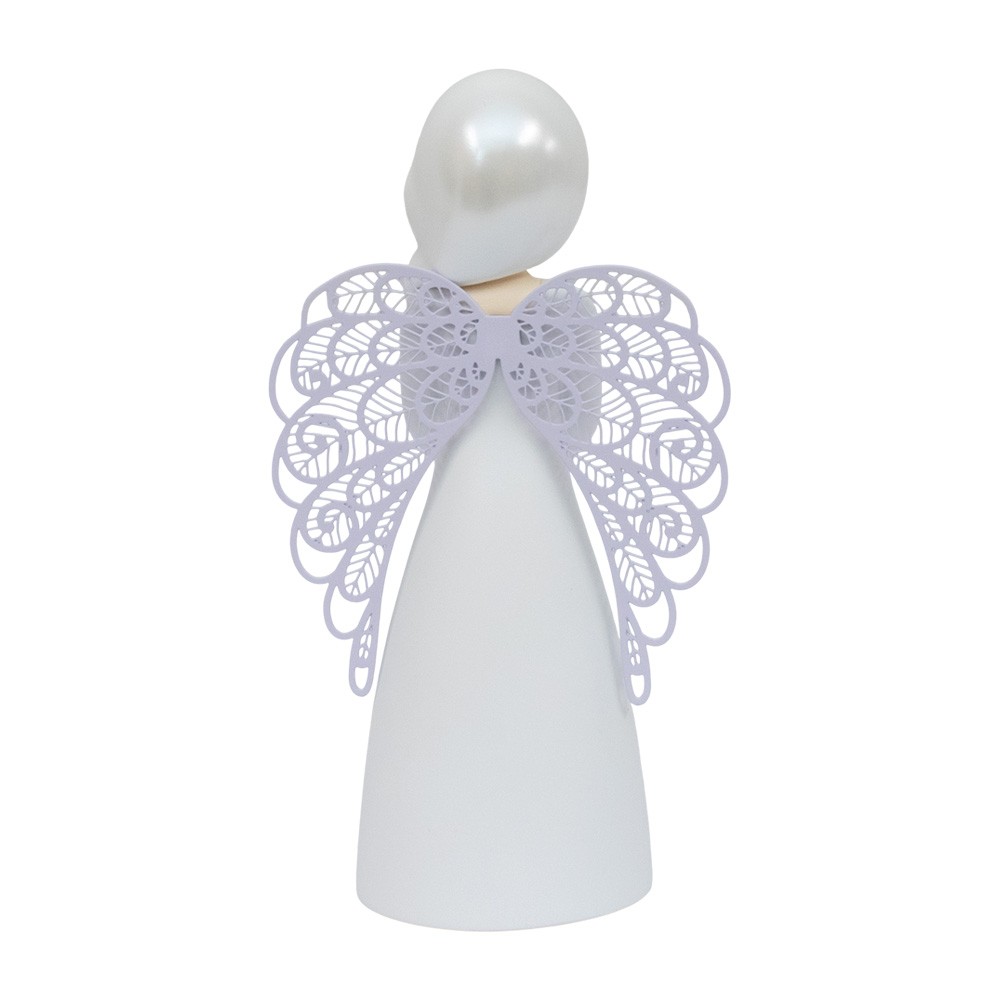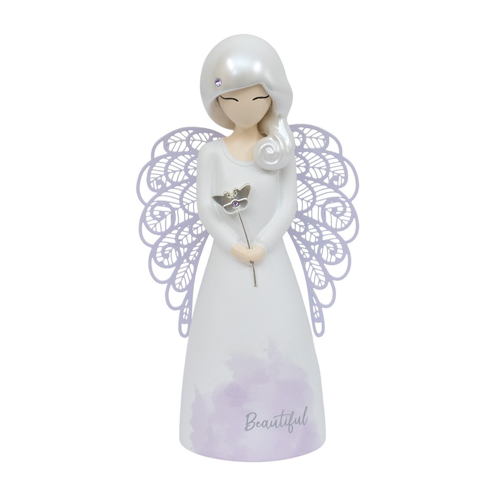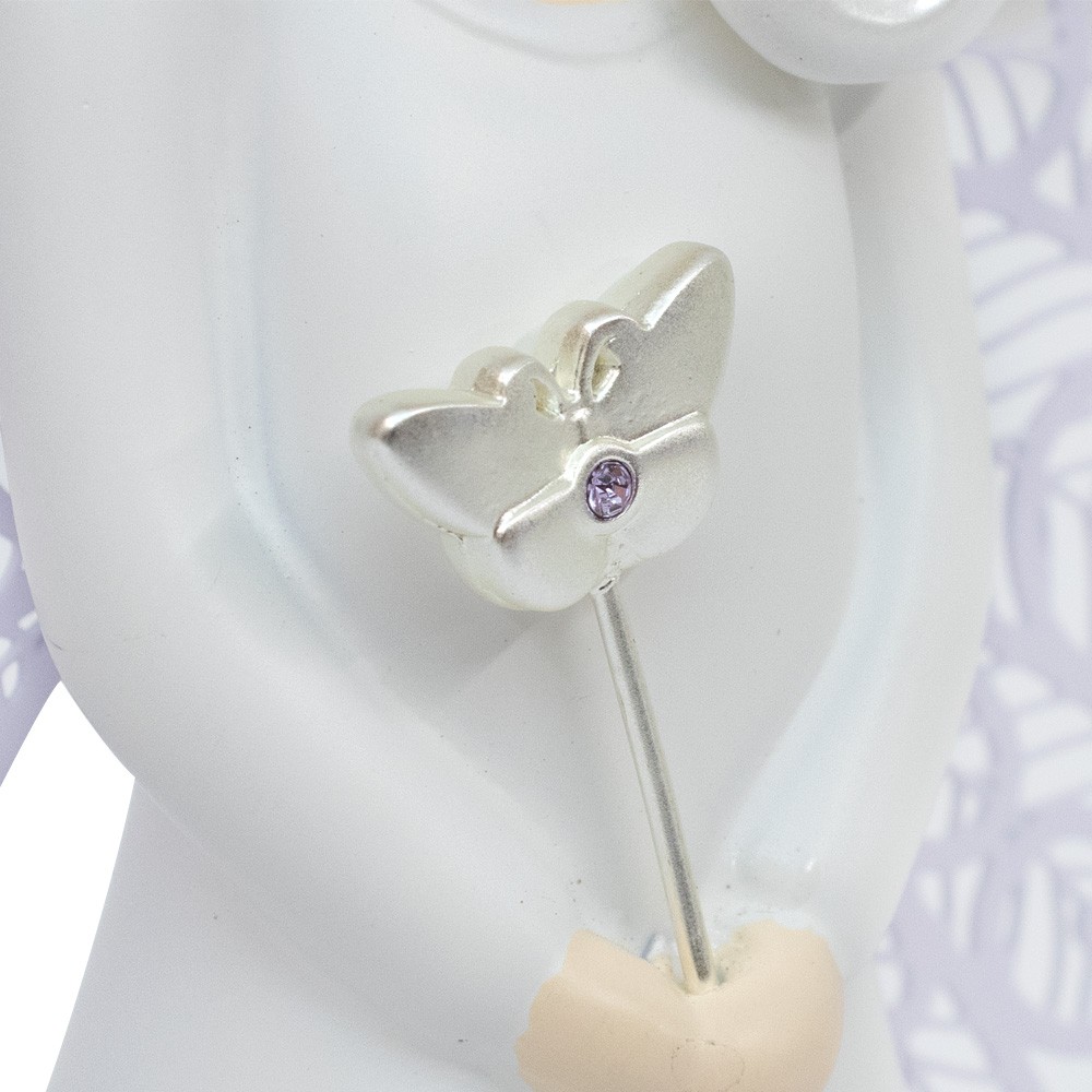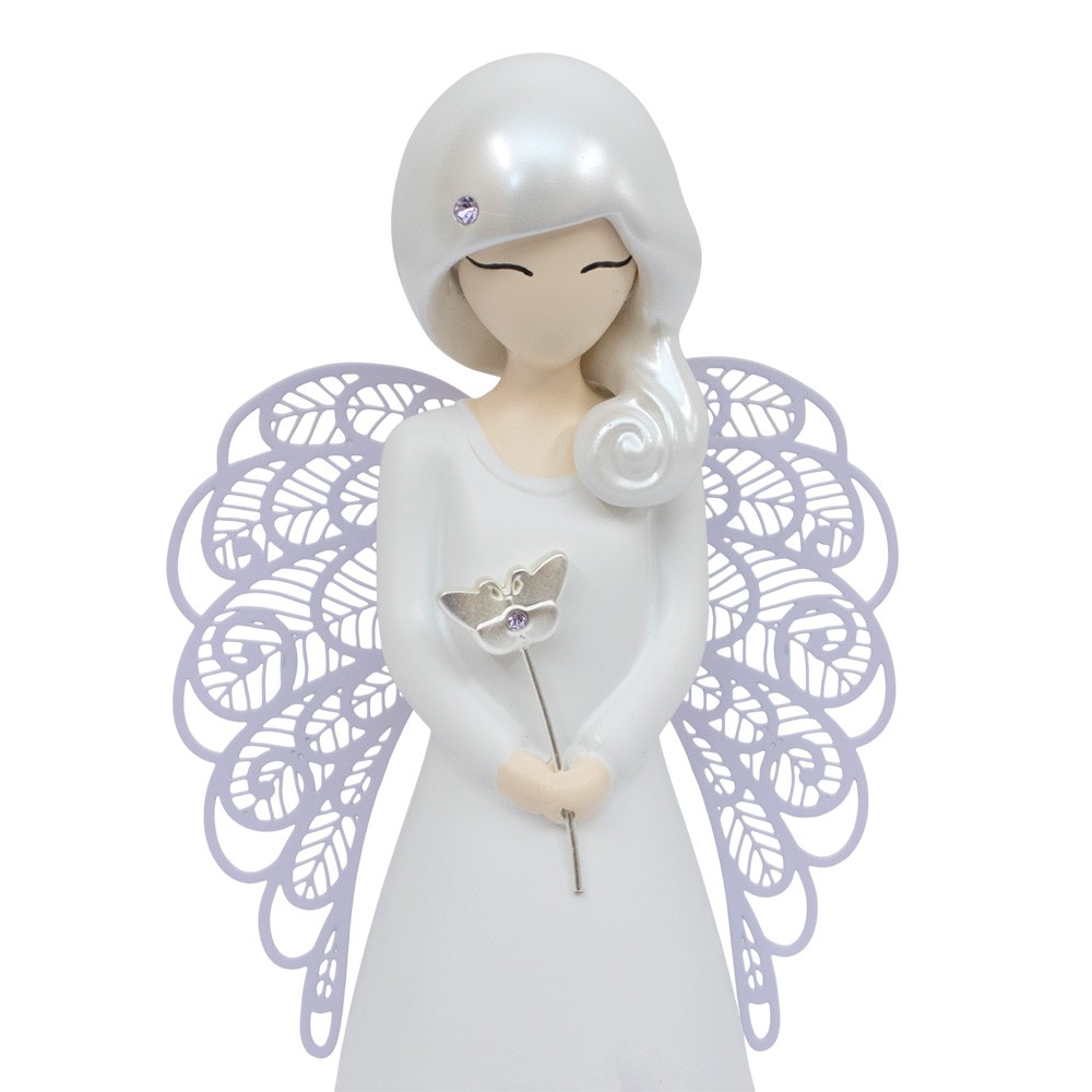 Made of resin with metal wings and entirely hand-painted, this elegant and high-quality angel holds a flower in her hands and features a rhinestone in her hair. It comes in a decorated gift box, perfect as a gift idea.