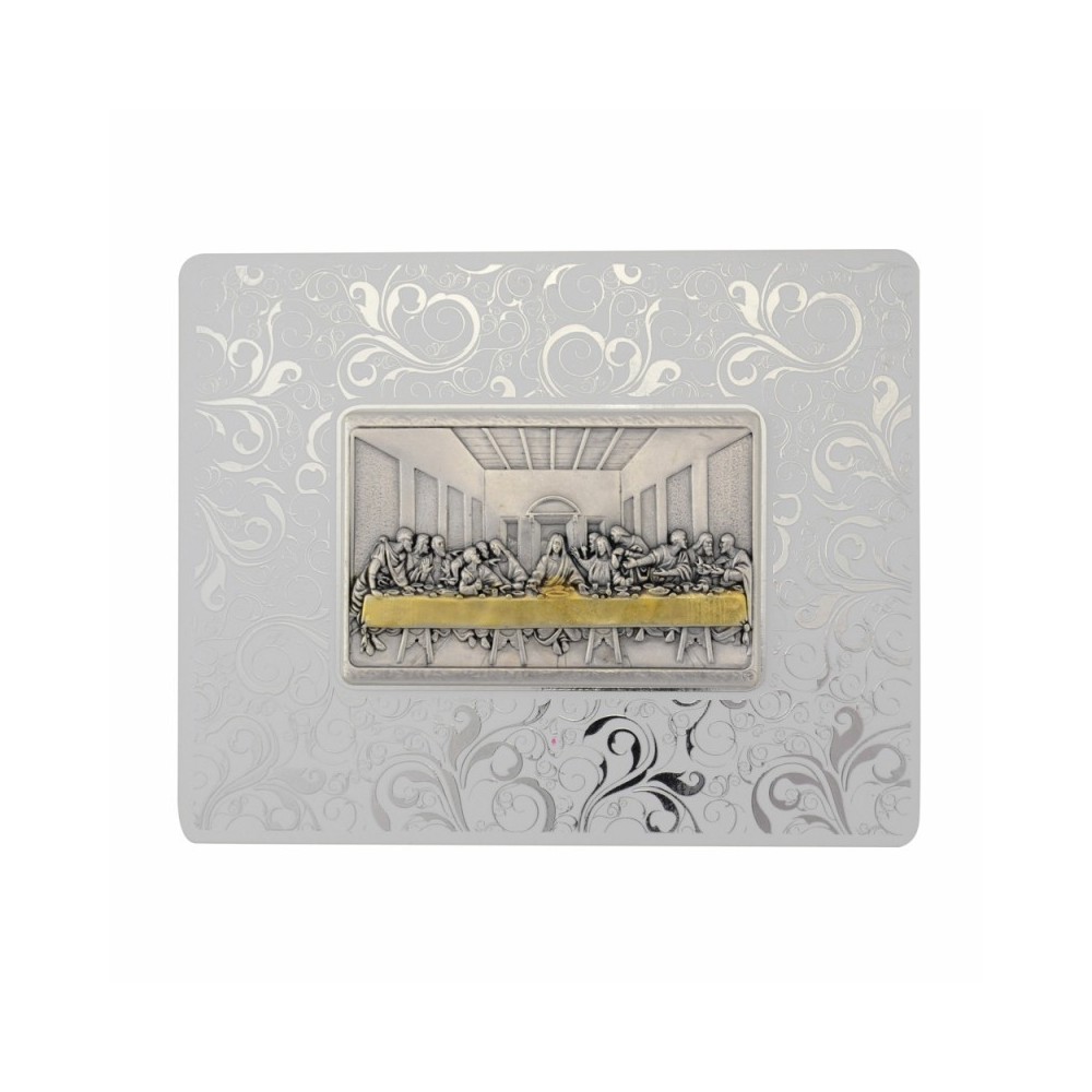 Rectangular picture made of wood with zamak plaque depicting the LAST SUPPER. The edges of the picture are made of white lacquered wood with rich floral decoration of silver color. Equipped with hole and metal support in order to hang it or place it on a surface. Supplied with box. Ideal as a favor for First Communion.
