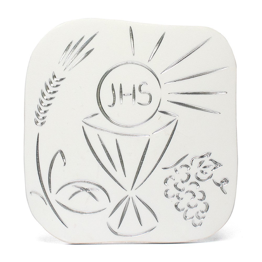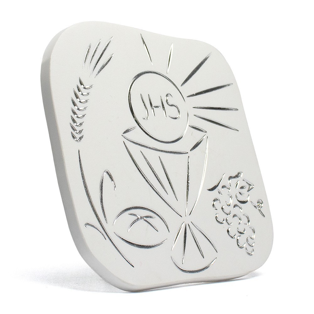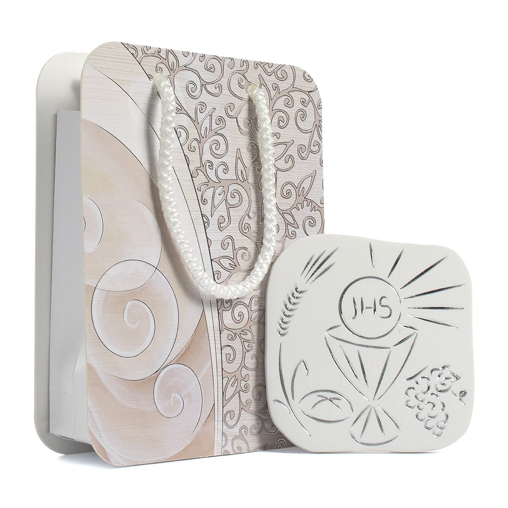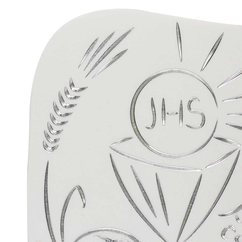 First Communion favor: picture and bag. The white picture with a modern design features carved decorations of silver color depicting the symbols of First Communion (chalice, grapes, bread and ears of wheat). The whole is supplied in a rigid bag which is finely decorated.