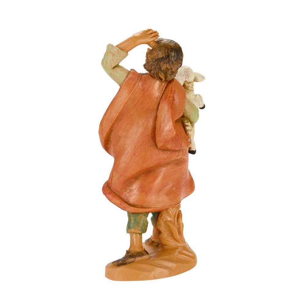 Statue depicting a boy holding a sheep. This statue is suitable for 11 cm Nativity scenes. Made of PVC by the well-known Fontanini company, which has been making high quality nativity scenes and religious statues for years with great attention to detail. Finely handpainted. Made in Italy.