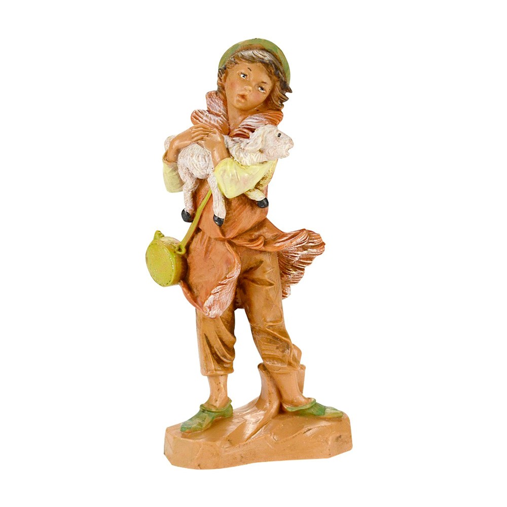 Statue depicting a boy holding a sheep. This statue is suitable for 11 cm Nativity scenes. Made of PVC by the well-known Fontanini company, which has been making high quality nativity scenes and religious statues for years with great attention to detail. Finely handpainted. Made in Italy.