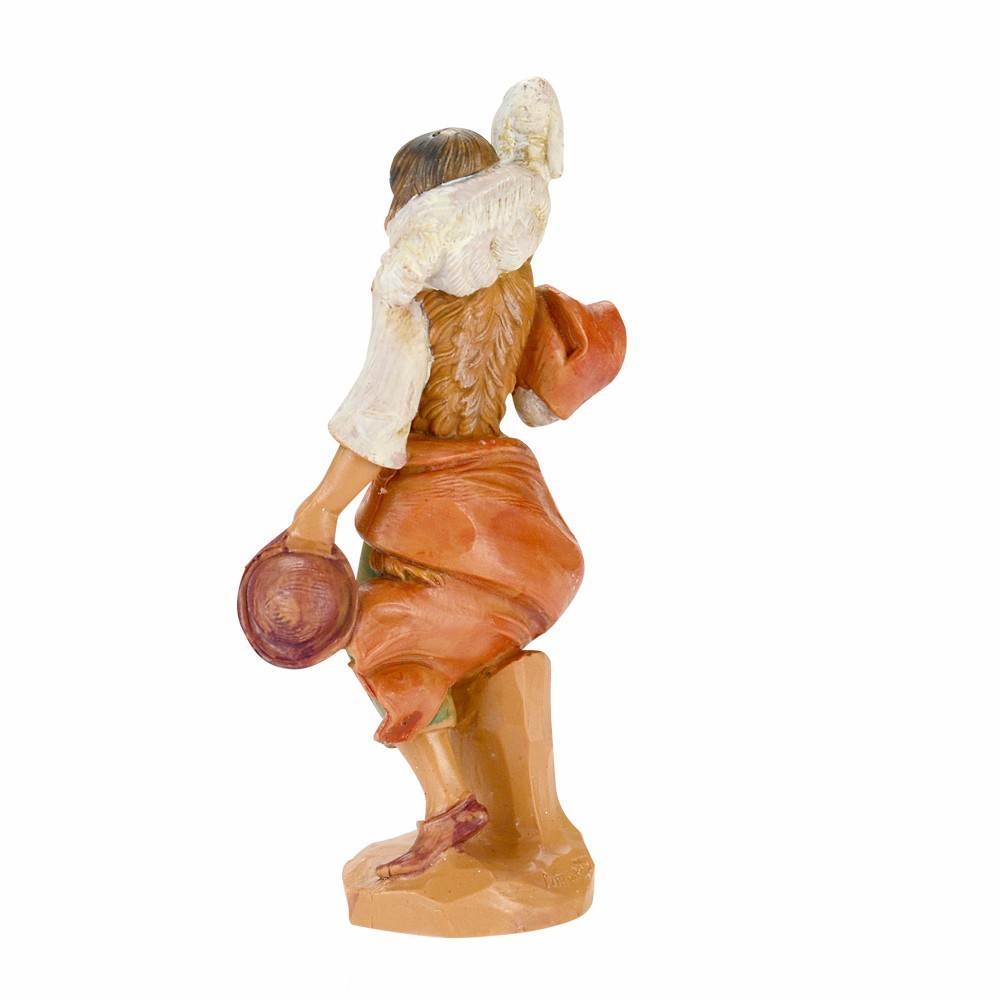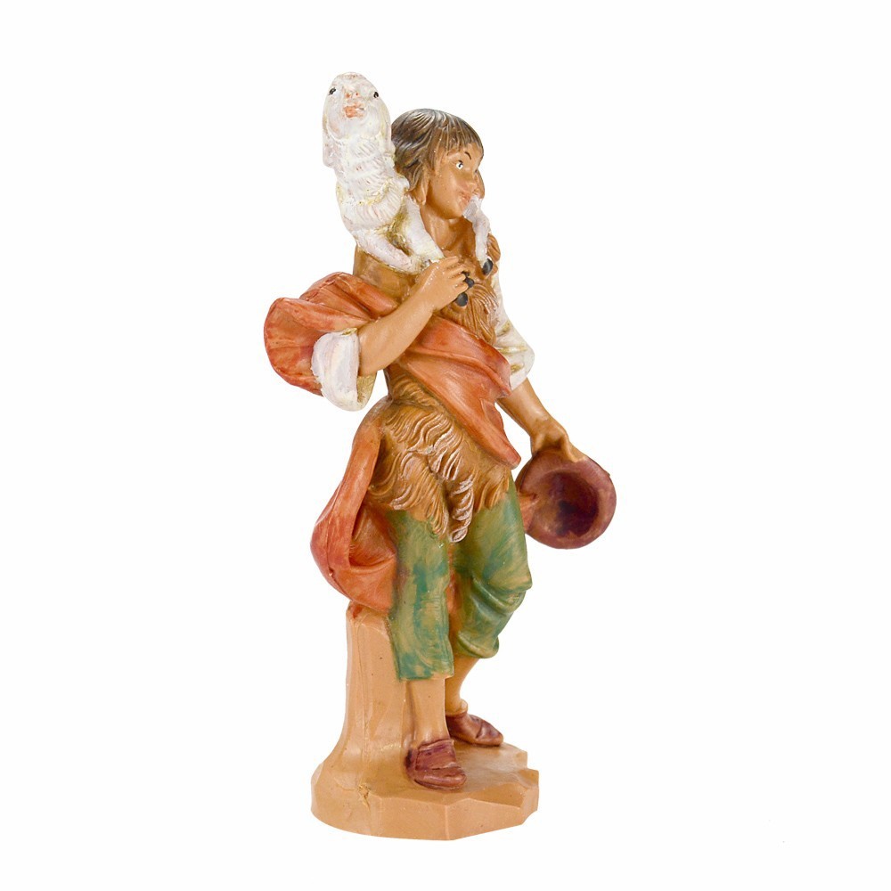 Statue depicting a boy with a lamb on his shoulders. This statue is made of PVC by the Fontanini company. Suitable for 11 cm nativity scenes. Finely handpainted. Made in Italy.
