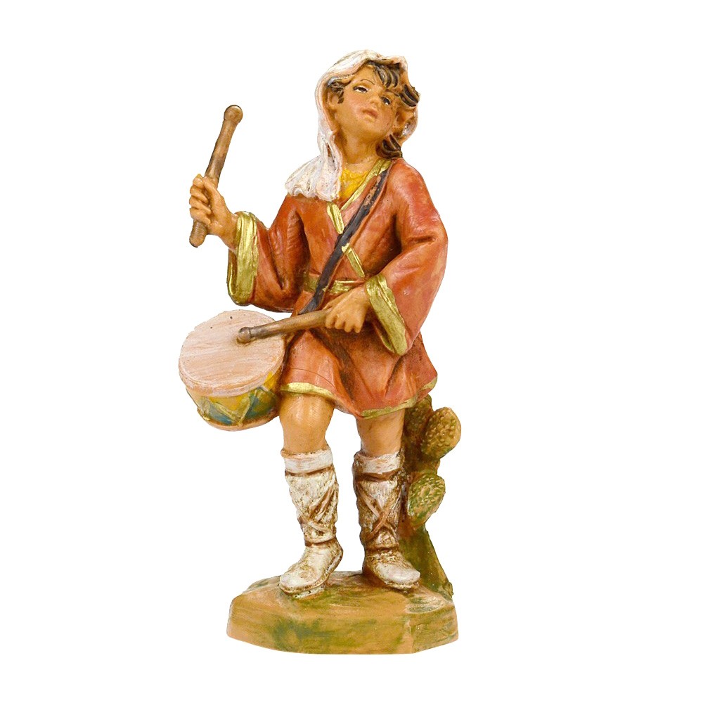 Fontanini statue depicting a shepherd playing the drum. This statue is suitable for Nativity scenes of 9.5 cm height. Made of PVC (unbreakable material) and finely painted by hand.