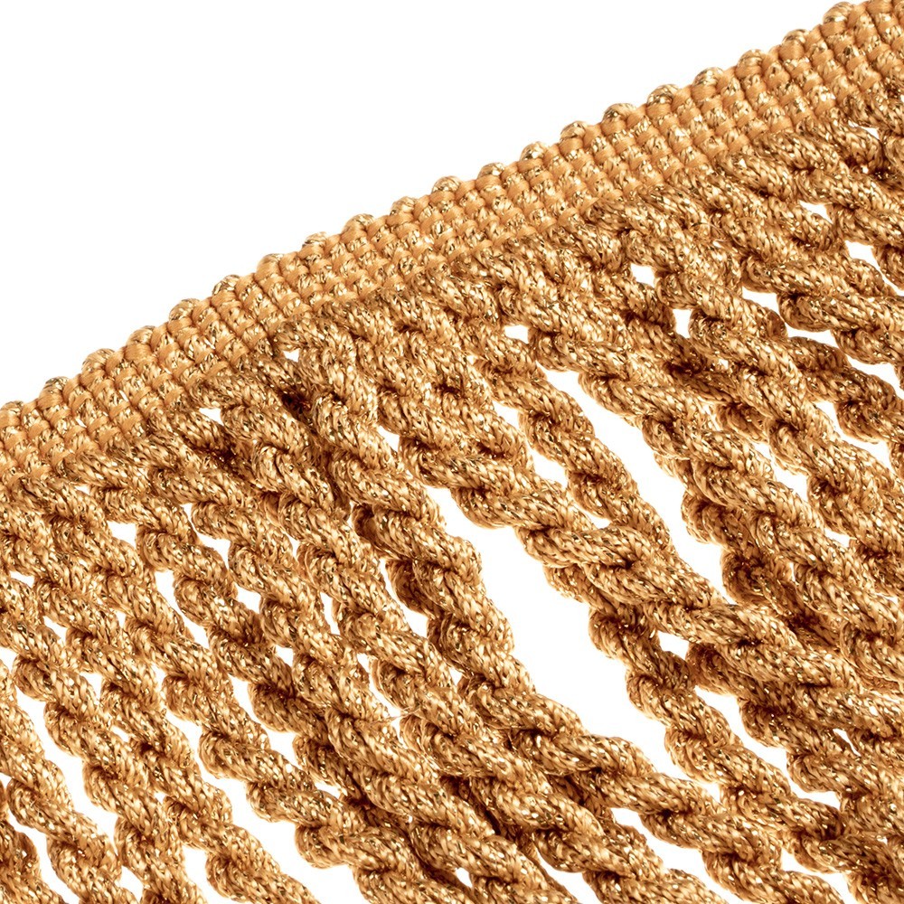 Twisted fringe trim in stainless gold metal. Height: 13 cm. This fringe trim is suitable to embellish liturgical vestments: altar cloths, priest stoles, diaconal stoles, chasubles, copes, etc.