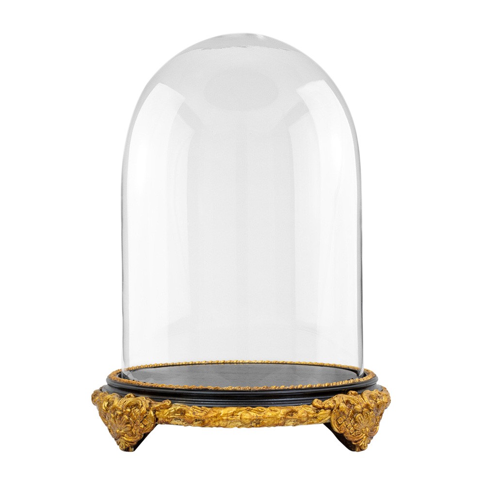 Glass bell complete with Baroque-style base covered in gold leaf.
