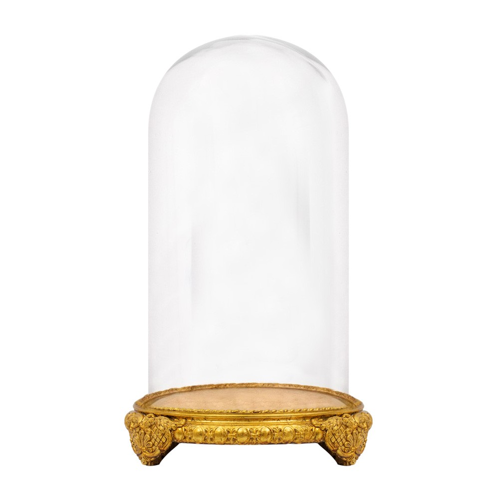 Glass bell complete with Baroque-style base covered in gold leaf.
