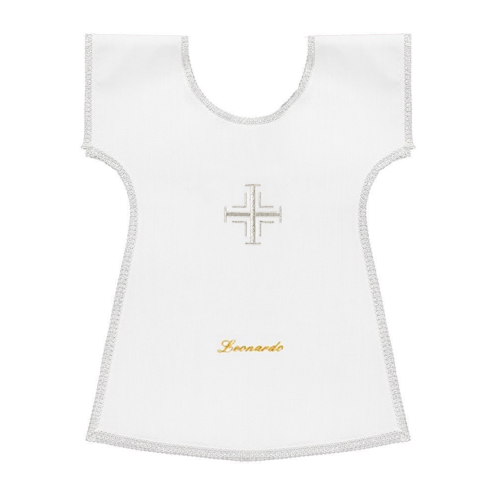 Baptism gown with lovely and delicate embroidery depicting the Jerusalem Cross. This gown is made of very light and fresh linen fabric. Entirely made in Italy.