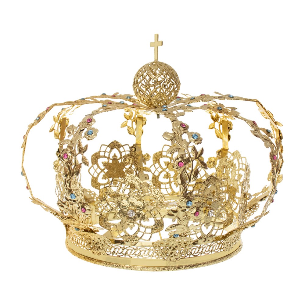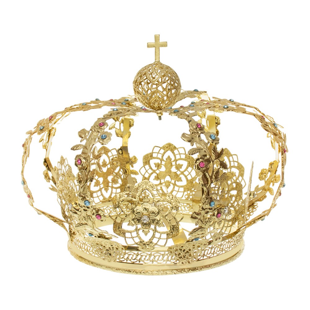 This crown is made of filigree brass in gold finish and it is enriched with small stones of pink and light blue color.