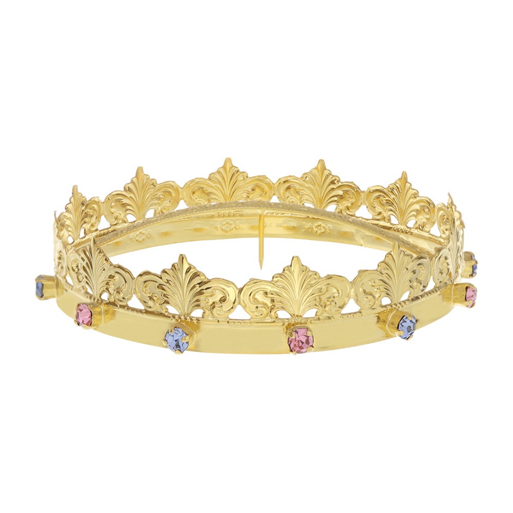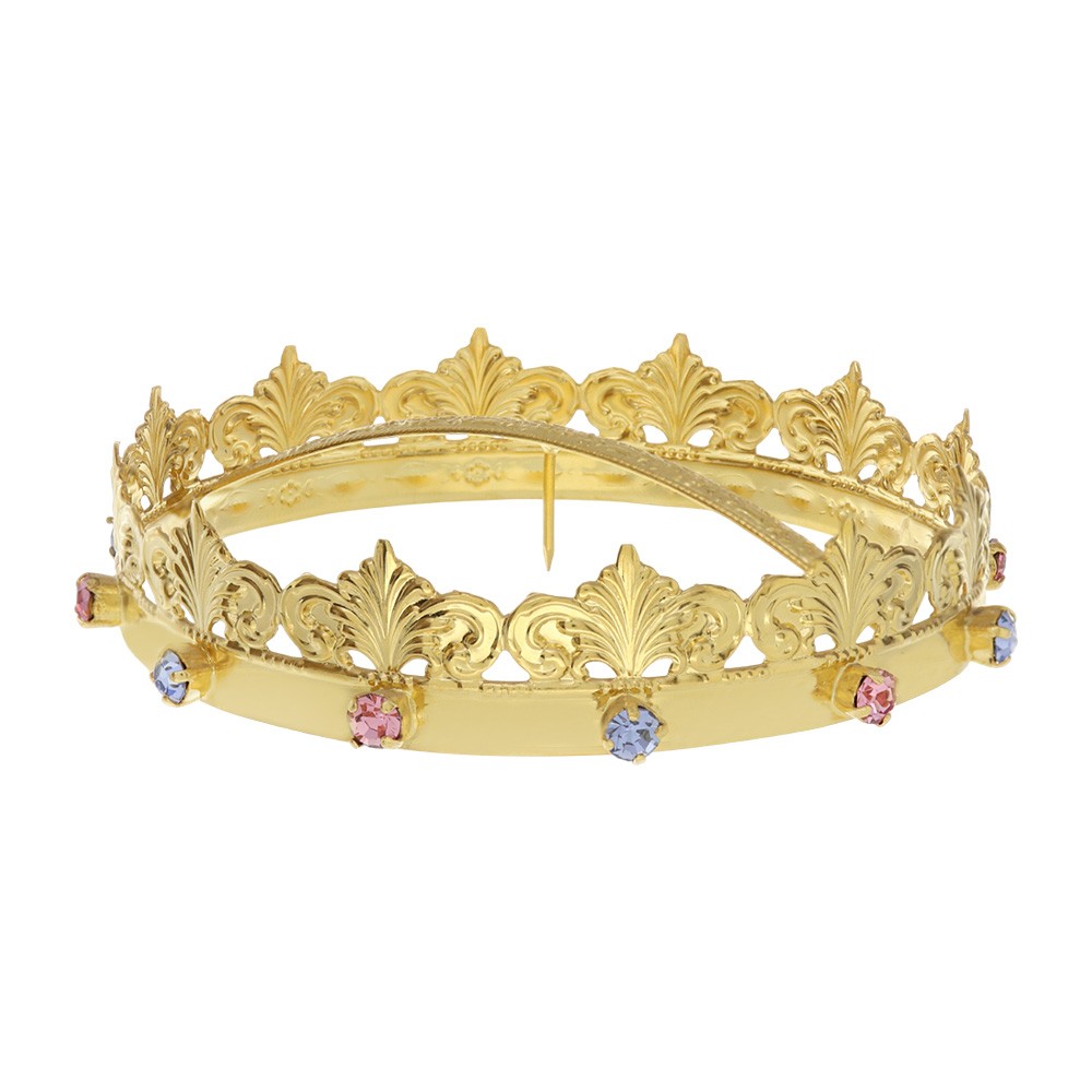 Small crown for statues of the Virgin Mary. Made of gold metal with pink and sky blue rhinestones.