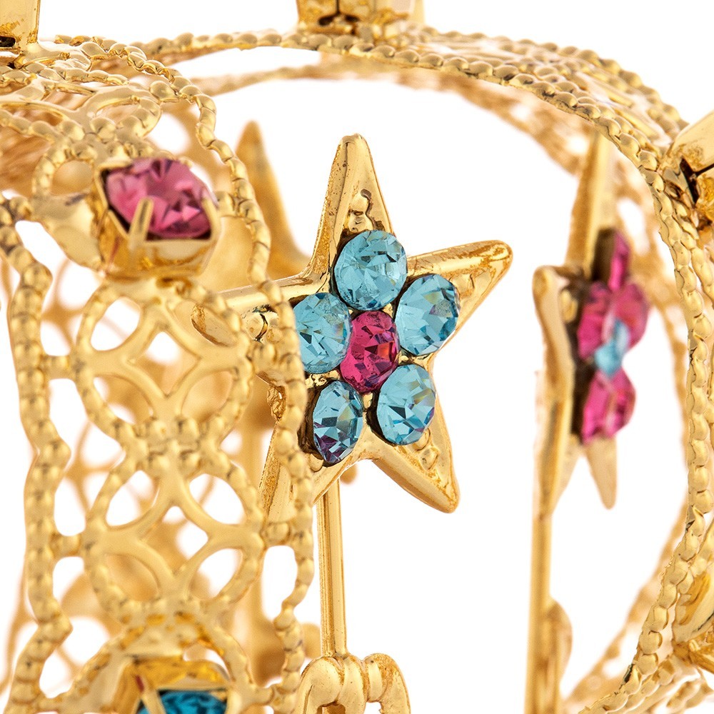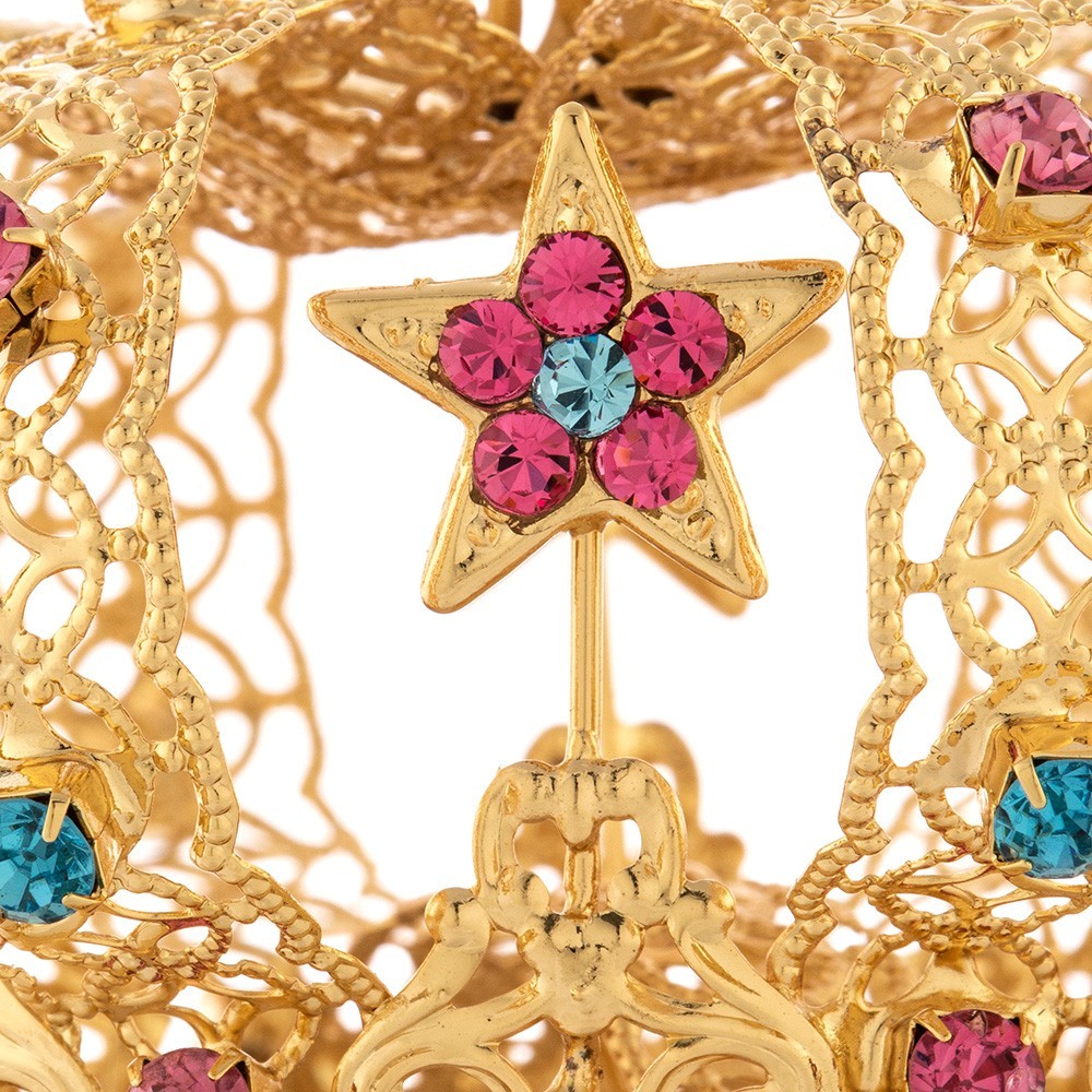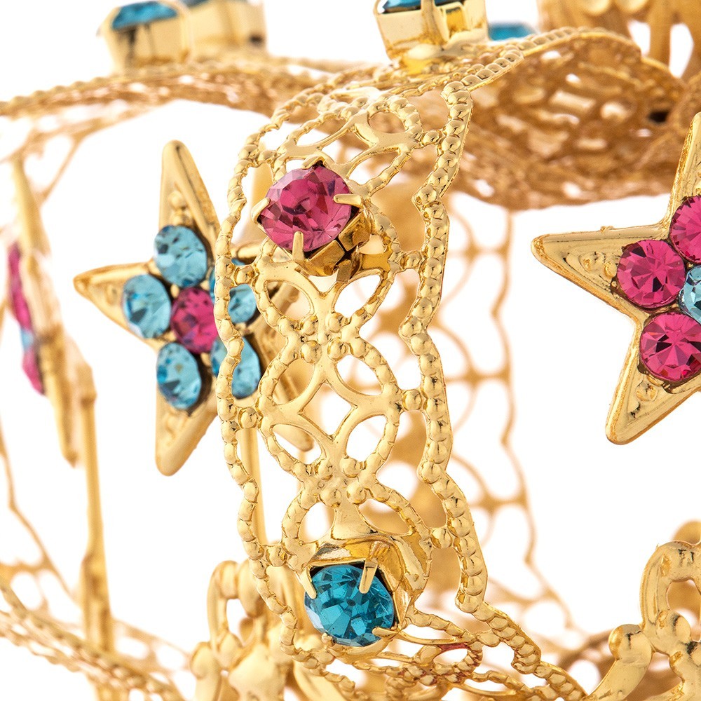 Elegant and refined crown for statue (imperial model); made of gilded brass and enriched with sky blue and pink rhinestones. Suited to adorn any kind of statues. Handicraft product in golden filigree. Made in Italy.