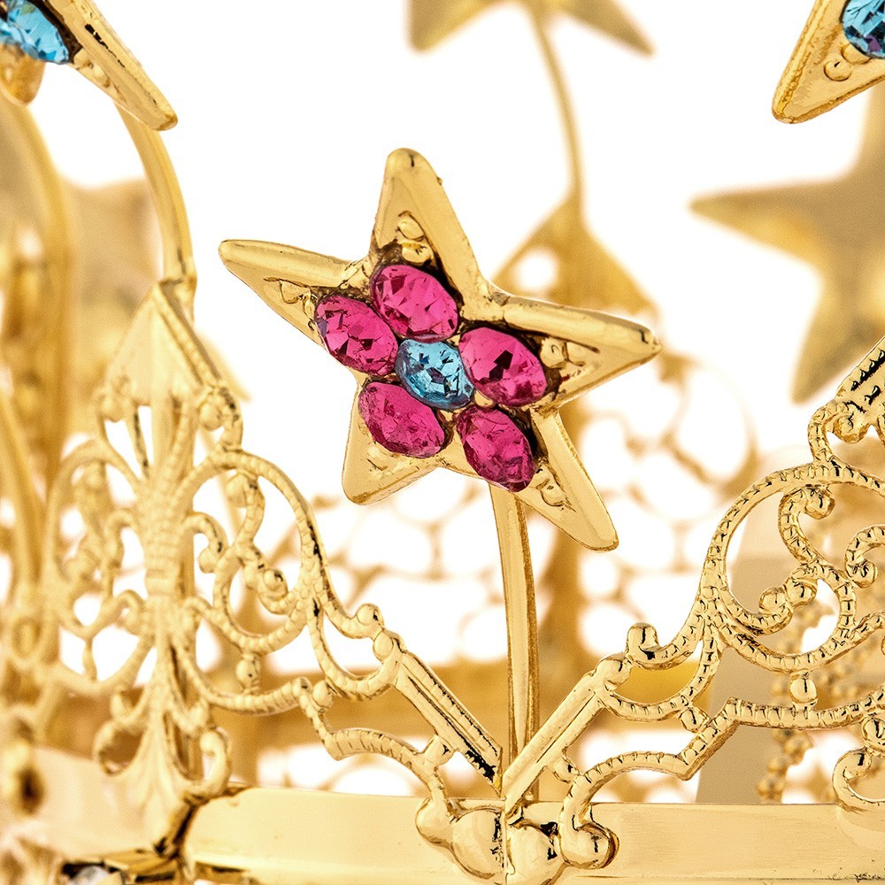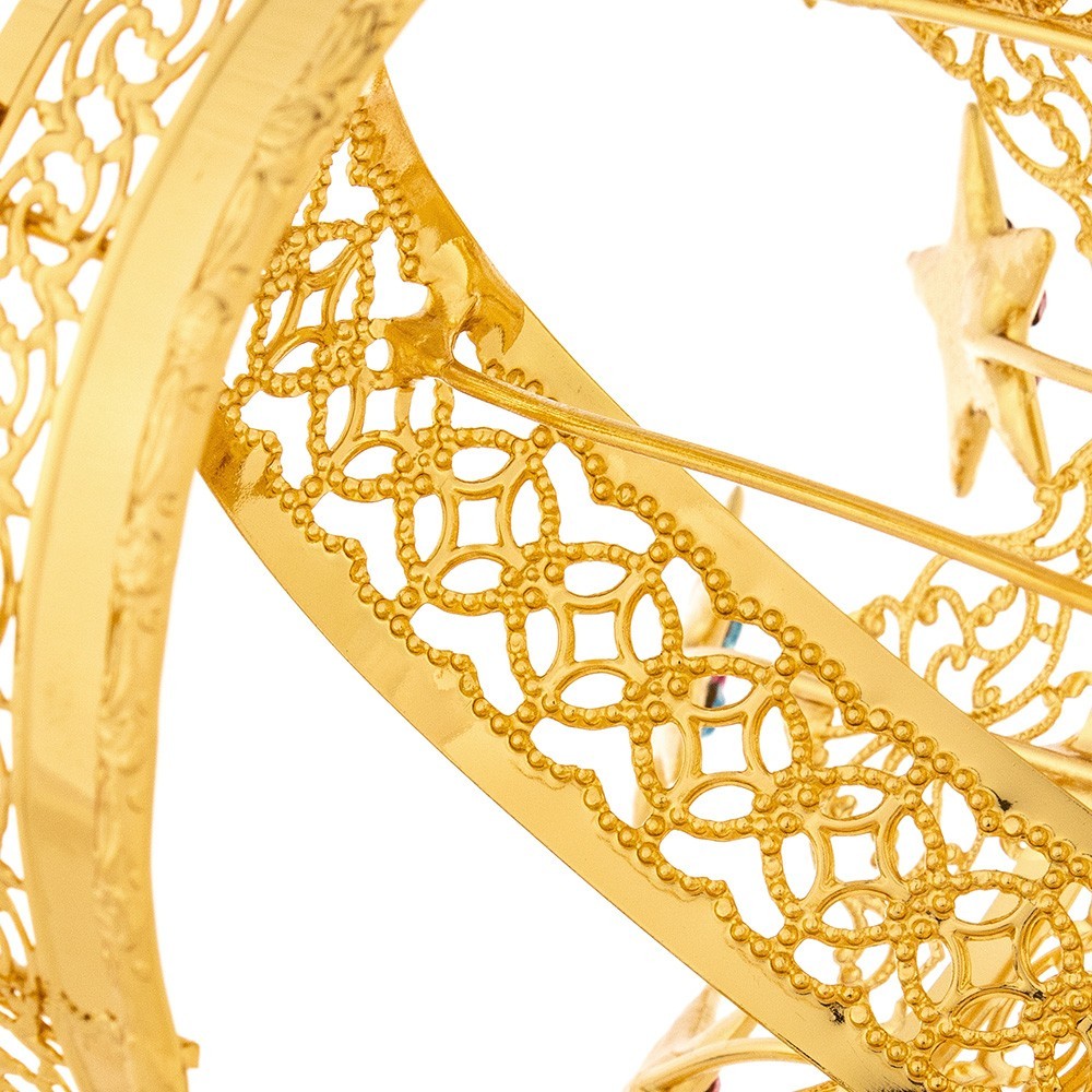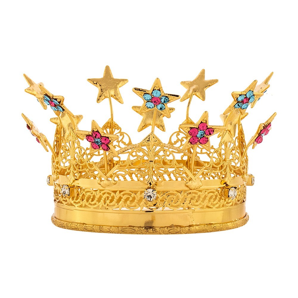 This crown is made of filigree brass in golden finish and is enriched with rhinestones in blue and pink crystals and star-shaped ornaments. Elegant and sophisticated crown, suited to adorn any kind of statues. Handicraft product entirely made in Italy.