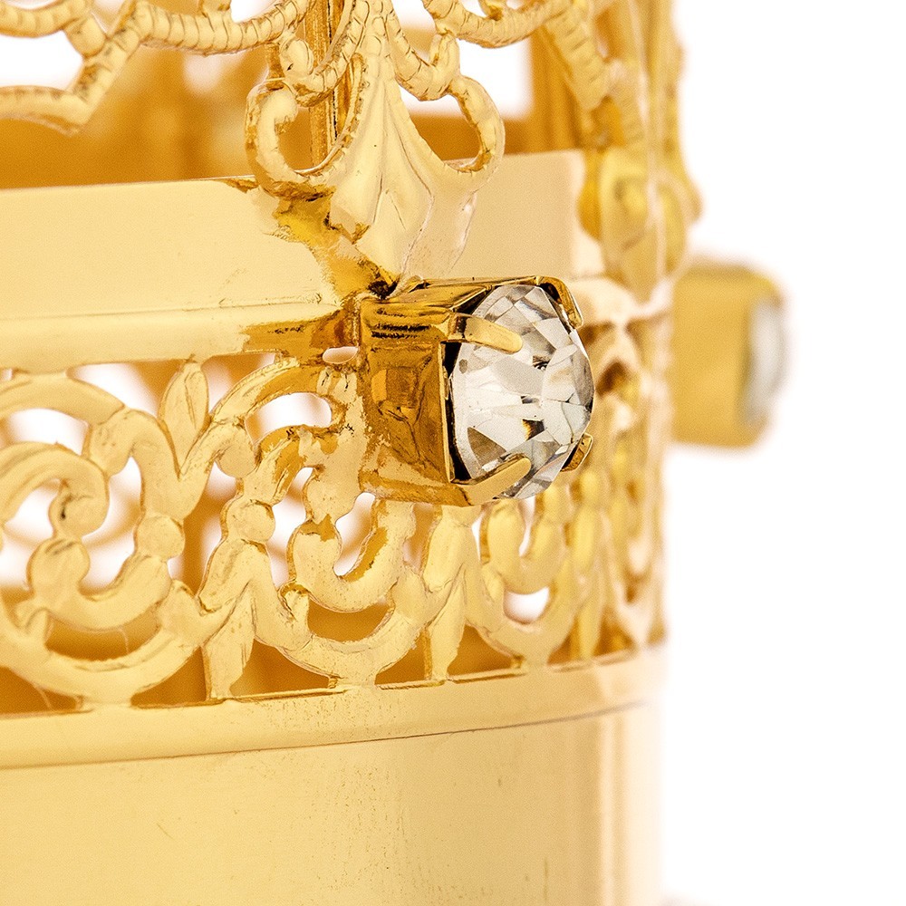 Crown in filigree brass with colored rhinestones.
