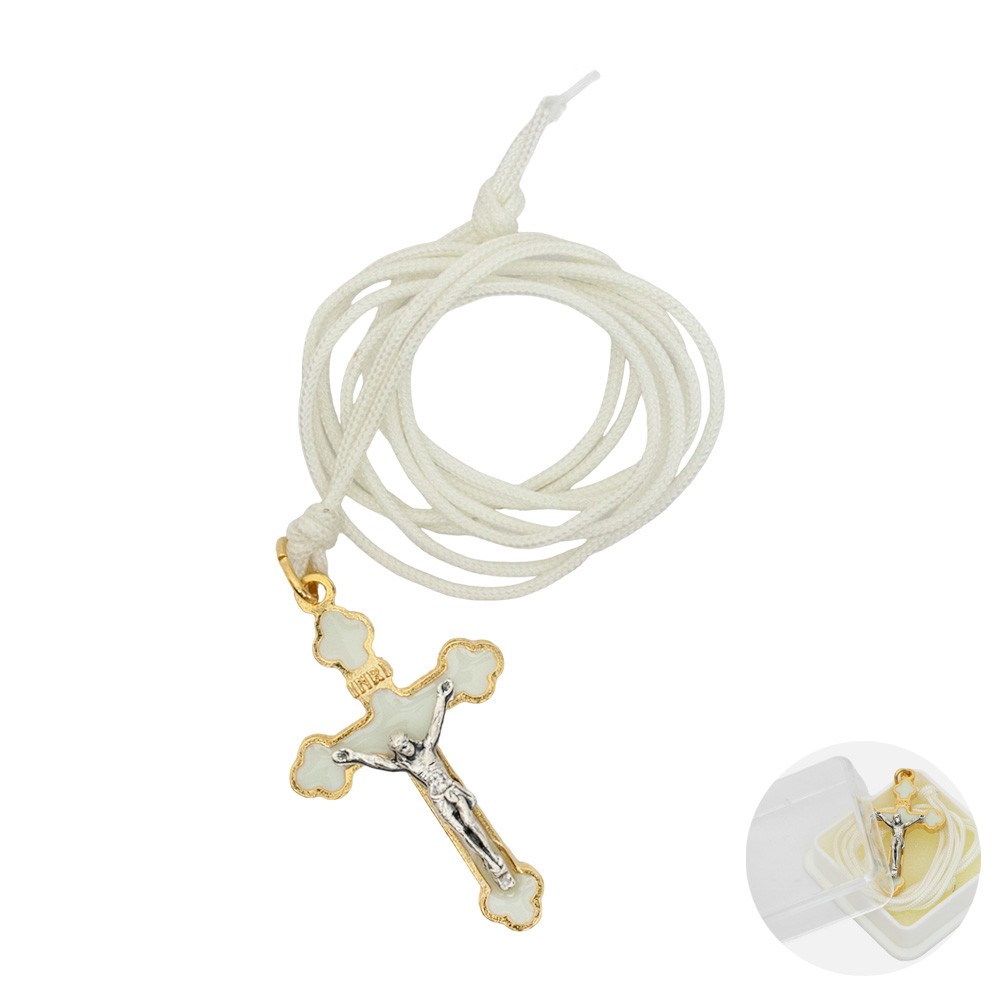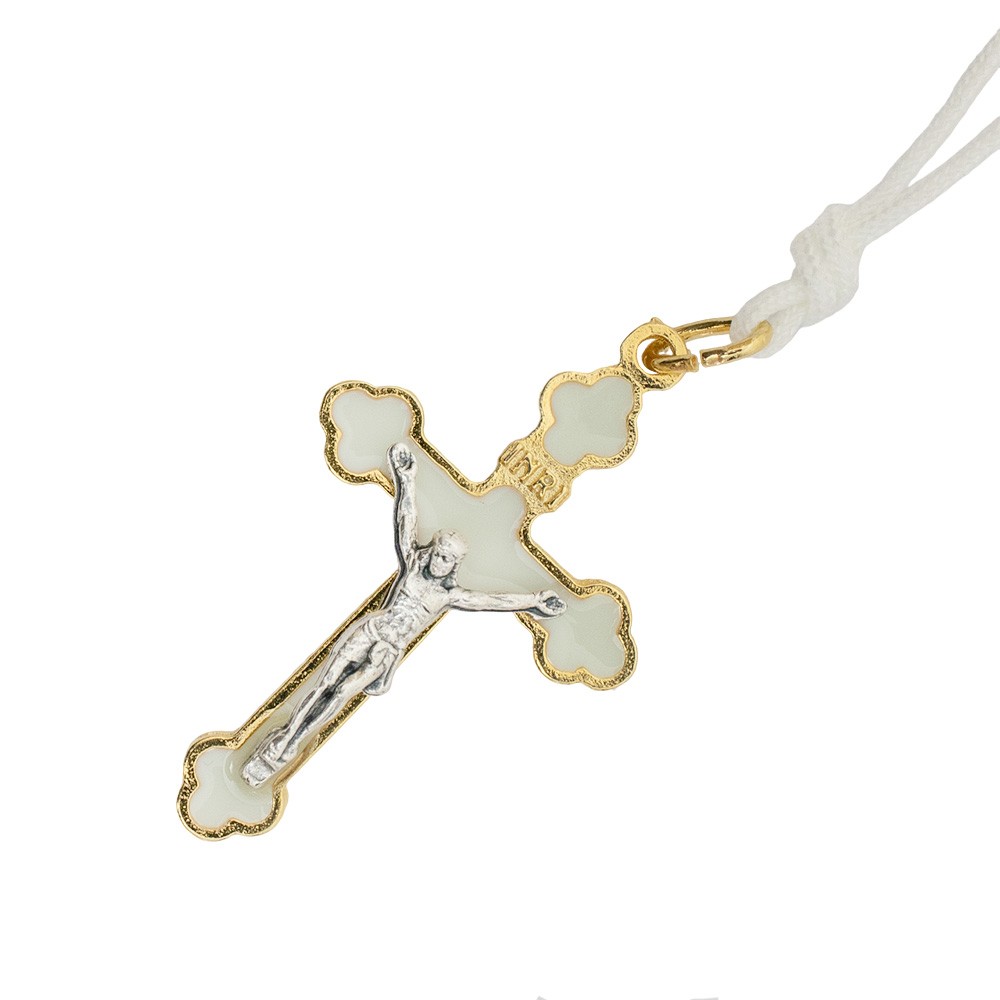 Trilobed cross pendant made of gold-plated metal and white enamel, complete with a white cord, perfect for wearing around the neck.