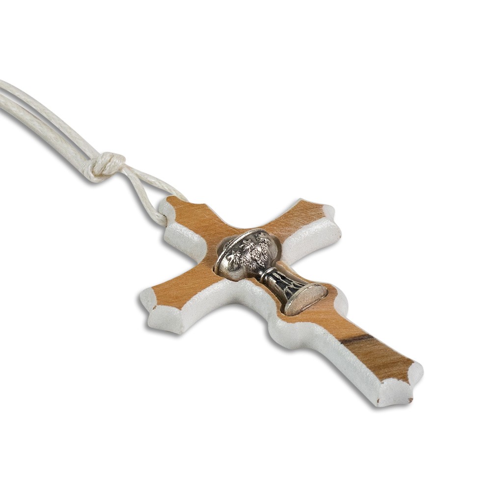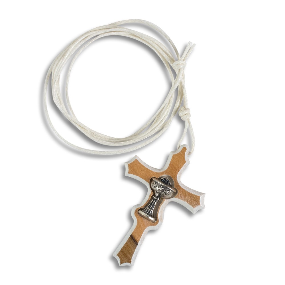 First Communion pendant cross in wood with white rope and chalice in metal. The cross is entirely made of olive wood.