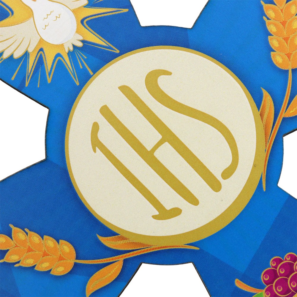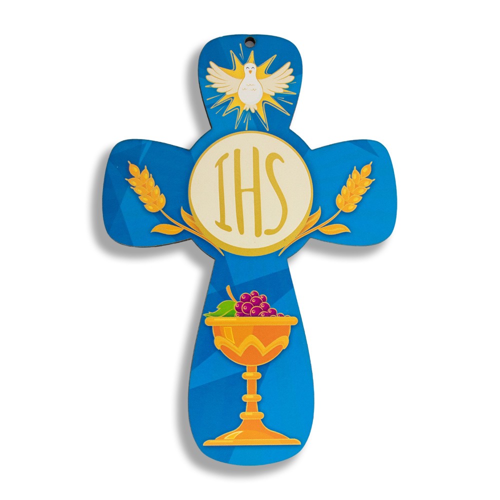 This First Communion cross, made of poplar wood with a blue background, is adorned with symbols of the sacrament.