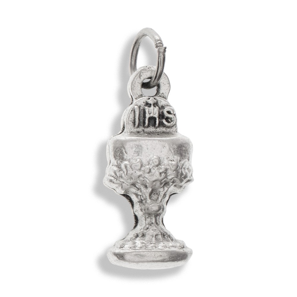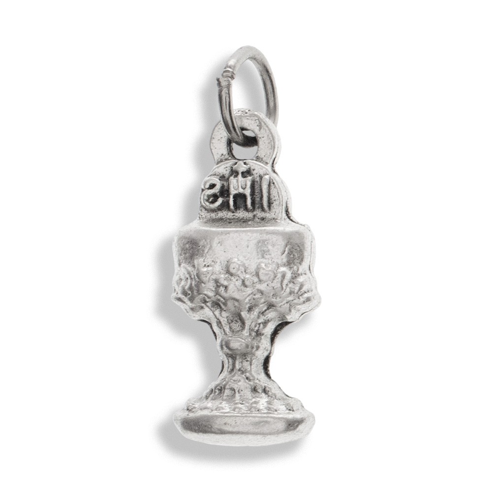 First Communion medal shaped like a chalice with JHS symbol. Made of metal in silver finish.