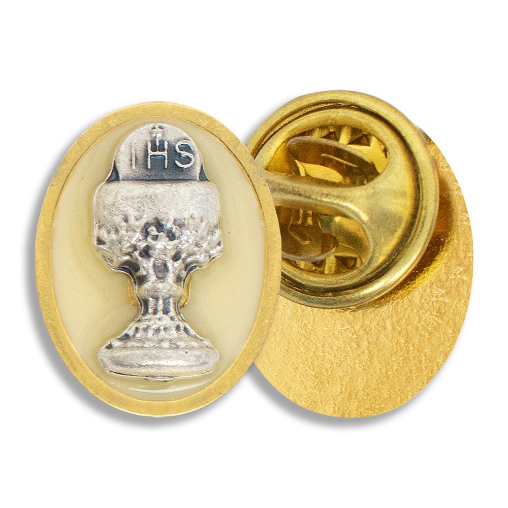 Pin medal featuring a chalice as a keepsake for First Communion.